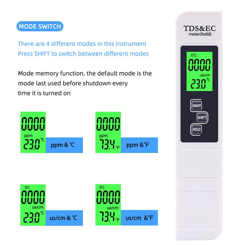 TDS/EC meter including a total of 4 different modes, press the SHIFT key to convert among different modes.