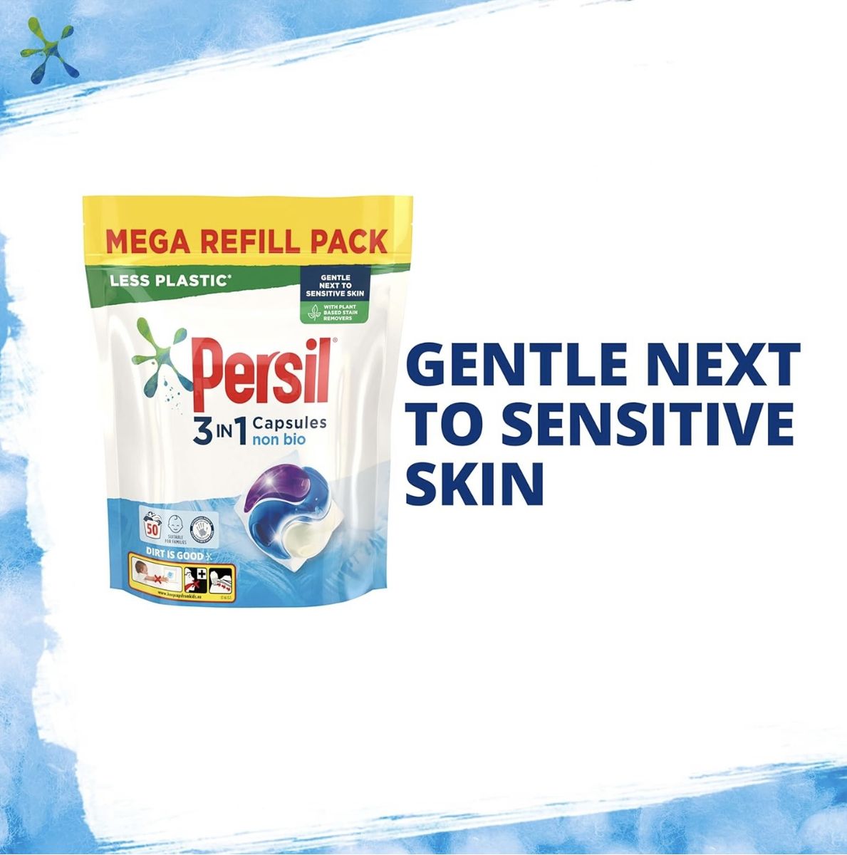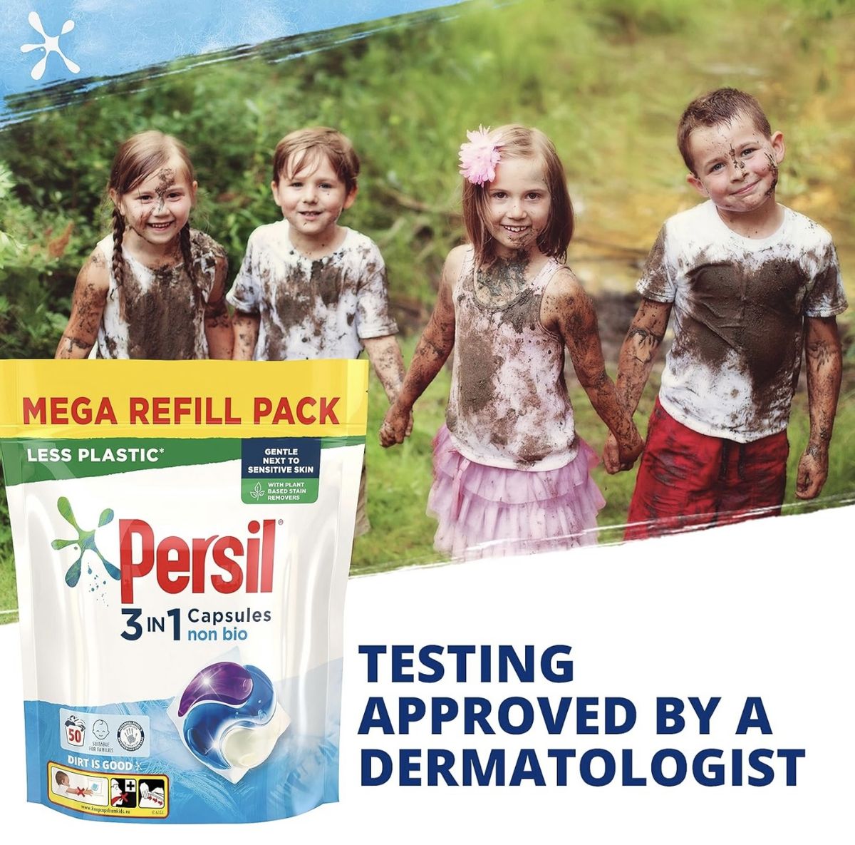 Persil 3 in 1 Non Bio Capsules power through stains, but remain gentle next to sensitive and delicate skin. The formula in these laundry detergent capsules is designed to keep colours bold while reducing bobbles on your clothes because a laundry detergent that's tough on stains doesn't have to be tough on colour too. The formulation of these capsules is made with plant-based stain removers and biodegradable ingredients, and, with our resealable pouch, they use less plastic per wash than our tubs. Tough on stains, kinder to our planet. You'll find enough colour capsules in this mega refill pack for up to 50 washes - ideal for families. Our 3 in 1 capsules are created to give you powerful stain removal and expert clothing care in one convenient pre-measured dose. Persil 3 in 1 capsules dissolve fast to get to work quickly. How to use: Simply place 1-2 capsules (depending on load size and water hardness) at the back of your washing machine drum before adding your clothes on top.