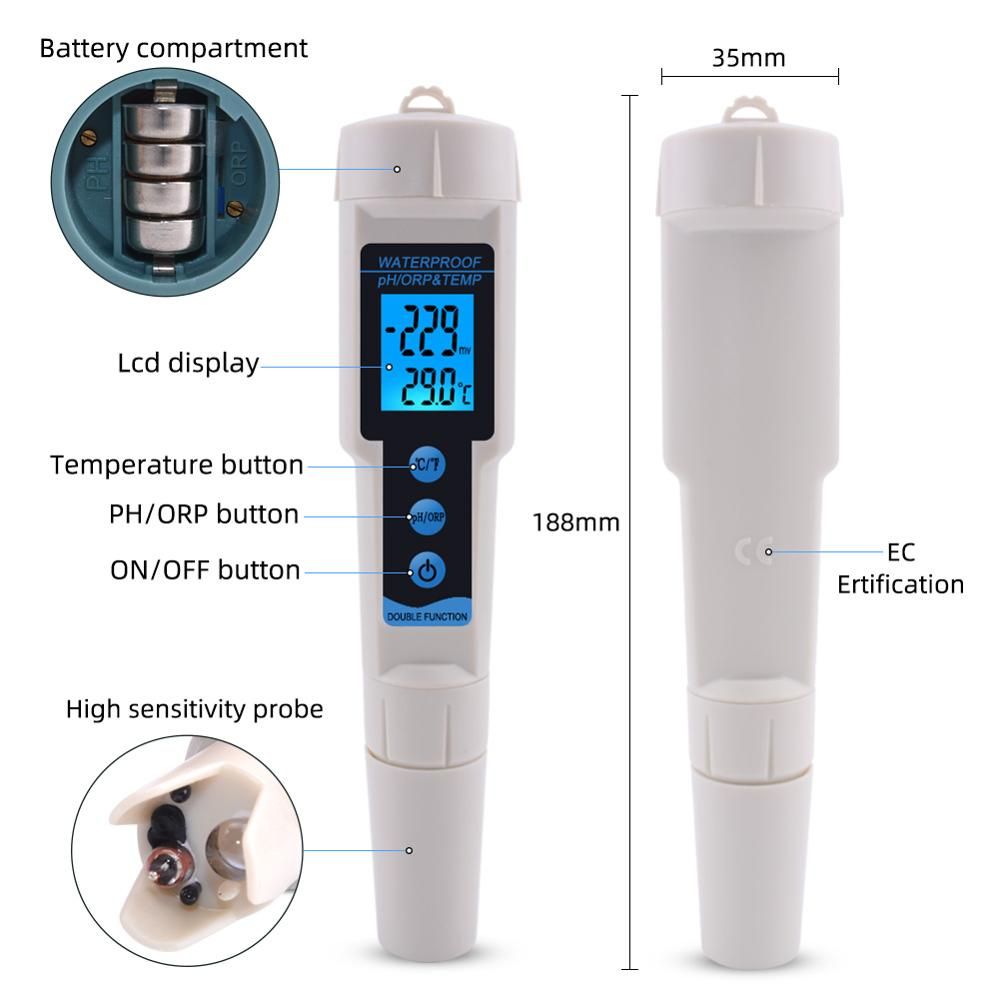 Specifications Measuring range:PH: 0.00-14.00pH ORP:-1999-1999mV Temp:0-50℃ Resolution:PH:0.01pH ORP:1mV Temp:0.1℃ Acuracy:PH:±0.1pH ORP:±5mV Temp:±1℃ Automatic Temperature Compensation.O℃~50℃ Batery Type:4×1.5V(AG13)(not included) Operating Temperature:0℃~50℃ Calibration:Manual.at one point through trimmer Dimensions:188mm×35mm×35mm Weight: 98g