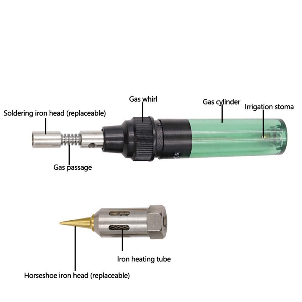Electric soldering tools are inconvenient in the field and will be affected by power outages, resulting in work interruption. 3 In 1 Portable Soldering Kit, no electricity needed, mini and light, weldable and repairable, safe and durable. Main Features This cordle soldering is a powerful electronic repair tool, delivers up to 35-45minutes run time. No electricity needed, it is convenient for indoor and outdoor use, such as 3D finishing, heat shrink, plastic cutting, all kinds of soldering, and more. Small and Portable Rapidly Heat Up & Temperature Adjustable Visible Gas Tank Multiple Uses A must have soldering machine for electronics, hobbyists and DIY enthusiasts. Attention: Gas is not included,you need to buy gas locally, and then fill into the soldering . This item is not auto-ignite, so you need to use your own fire source to start it. Replace the soldering tip, please replace it after cooling or replace it in advance. Do not touch the soldering head at high temperature when using. Store it after cooling, do not put it in high temperature or direct sunlight. Put it in a proper place to avoid the children or fall off. It is neceary to clean the nozzle often because of impure gas. Specifications Material: Plastic + Metal Color: Green Filling Capacity: 8ml Fuel: Pure (Gas) Flame Temperature: 1300℃(Adjustable) Soldering Temperature: 450℃(Adjustable) Use Time: 35-45 Minutes Net Weight: Approx. 69g Package Includes: 1x 3 In 1 Portable Soldering Kit