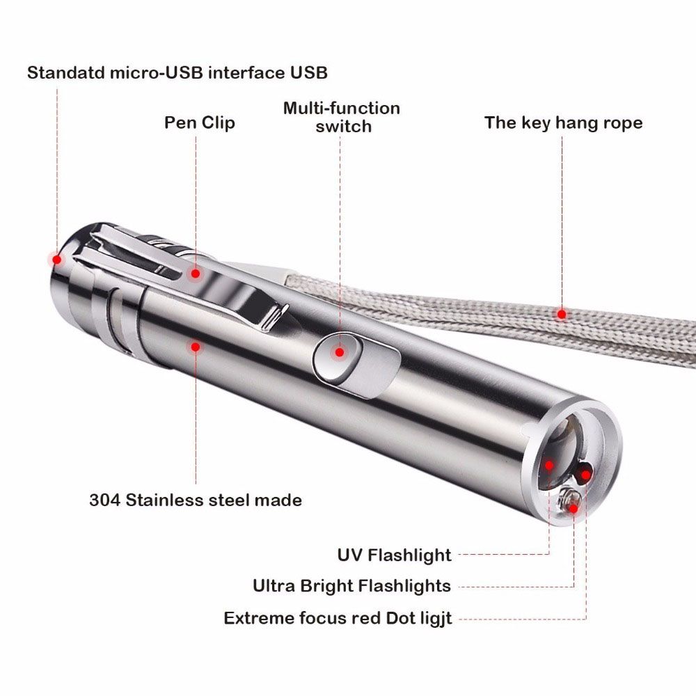 100% Brand New Type:Laser Sight Colour:Sier Material: Stainle steel Size:117*16*16MM Description 3 In 1 Design--Three light modes:Laser , Led moon light , Uv light. 1. Super Long Distance--The red laser can project over 100 feet(indoor).With this cat laser light,you can just sit on sofa and interact with your cat without running here and there. 2. Rechargable & Charge Quickly & Long Last--USB charge and it can be fully charged in about 1.5 hours.Then it can last about a week by teasing cats.You can link any device with a USB port for charging. 3. Safe & High Brightne --Led lamp with imported double led bulb, more bright and safer than normal cat laser pointers.You can tease your cat anytime, no matter day or night. Package Includes: -1x Cat Led Multi Function Laser Pointer -1x Usb recharging cable Note: There is 2-3% difference according to manual measurement.Please check the size carefully before you buy the item. Please note that slight color difference be acceptable due to the light and screen.