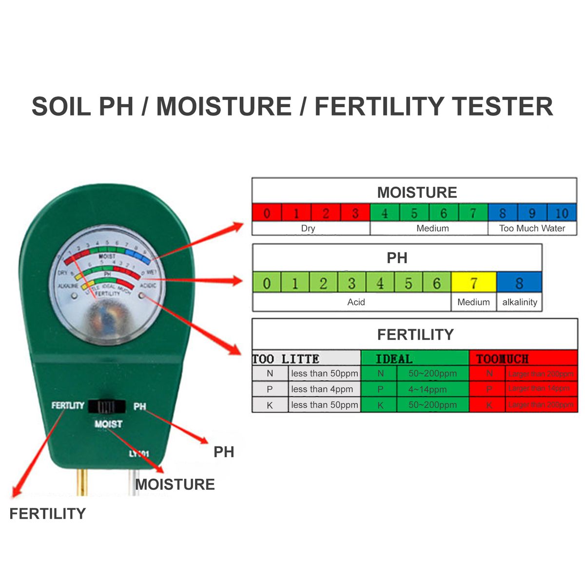 [Moisture Test]When the value is 1-3(Red), watering is required. Values of 4-7(Green) indicate that the moisture content is appropriate. A value of 8-10(Blue) indicates too much water.