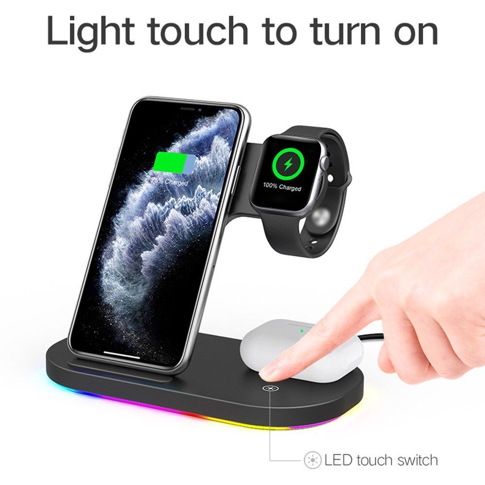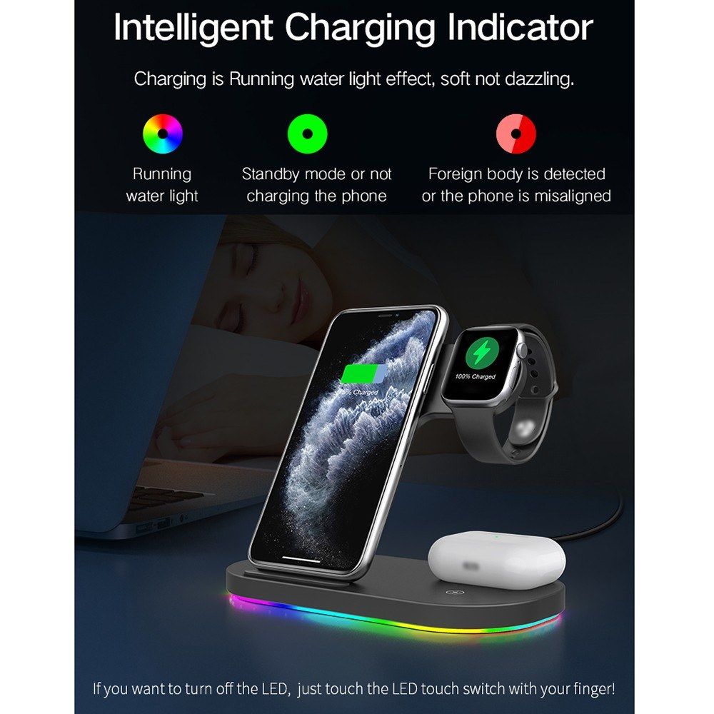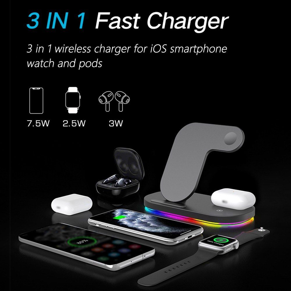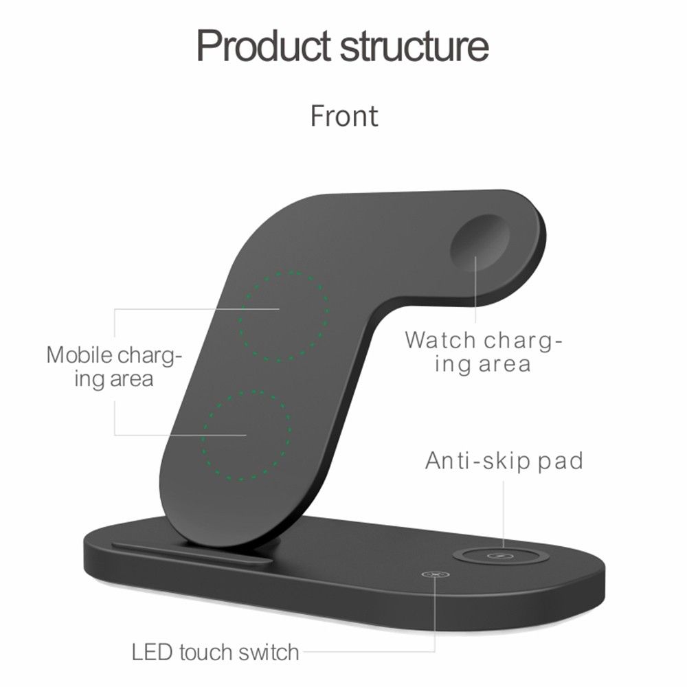 3 in 1 wirelessly charger, can charge 3 Qi-enabled devices including phone, watch and earphone at the same time.