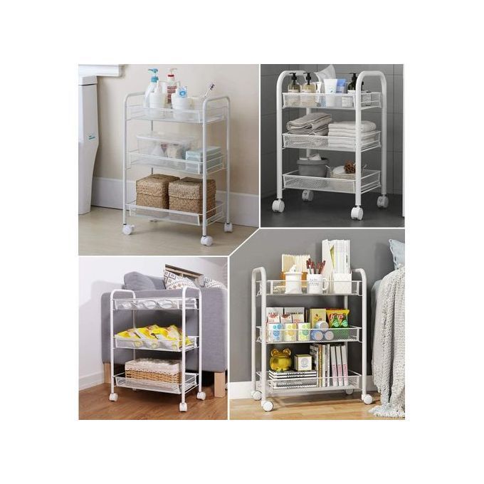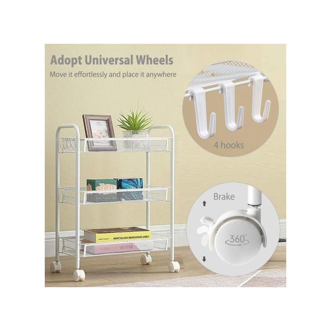 About this itemLarge Capacity 3 layers Rolling Cart/Trolley With individual strong utility trays, 1 hanging basket and 4 hooks for storage and saving space, this trolley rolling storage cart makes your home more org4nized. Built to Last All-metal Utility Cart With classic metal design, which is definitely more durable, sturdy, stable, safer than the plastic one, the trolley rolling cart organizer can withstand 42-60lbs of weight, of which each basket can withstand 9-15lbs of weight, 50% better than the same type of mesh cart. (For a smoother cart ride, it is recommended to put no more than 10lbs per basket).Easy and Efficient Installation You'll have this utility carts with wheels assembled in minutes. Even the children could handle it. Switching between Moving and Anchoring Rolling by 4 wheels, which is flexible and lockable (2 locking), the trlley/ cart could through anywhere smoothly, meanwhile be fixed position on the sleek surface, having both mobile storage tower and storage rack usage. Convenient metal mesh design Equipped with metal wire mesh, which helps drain, dry and filter through dust particles, perfectly reducing cleaning housework, as lazy furniture, the trolley/cart as the laundry organizer or cleaning supplies organizer makes your home life easier and worry-free.