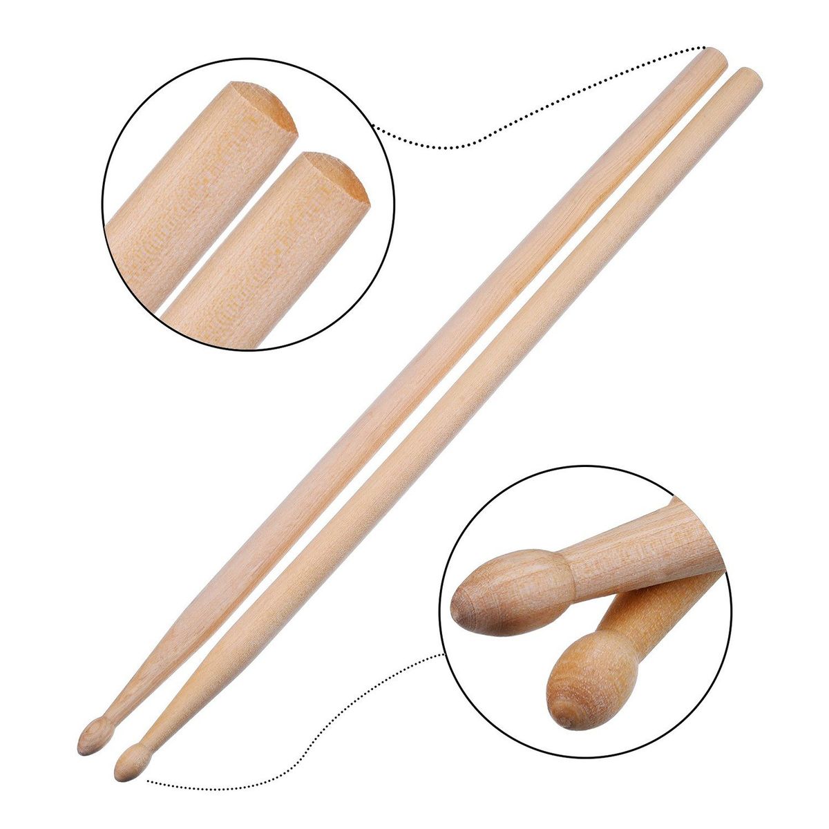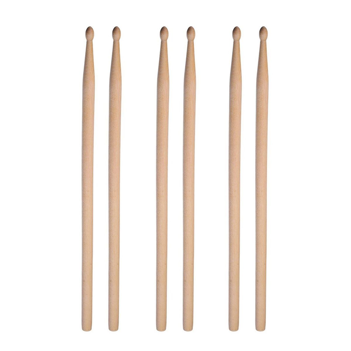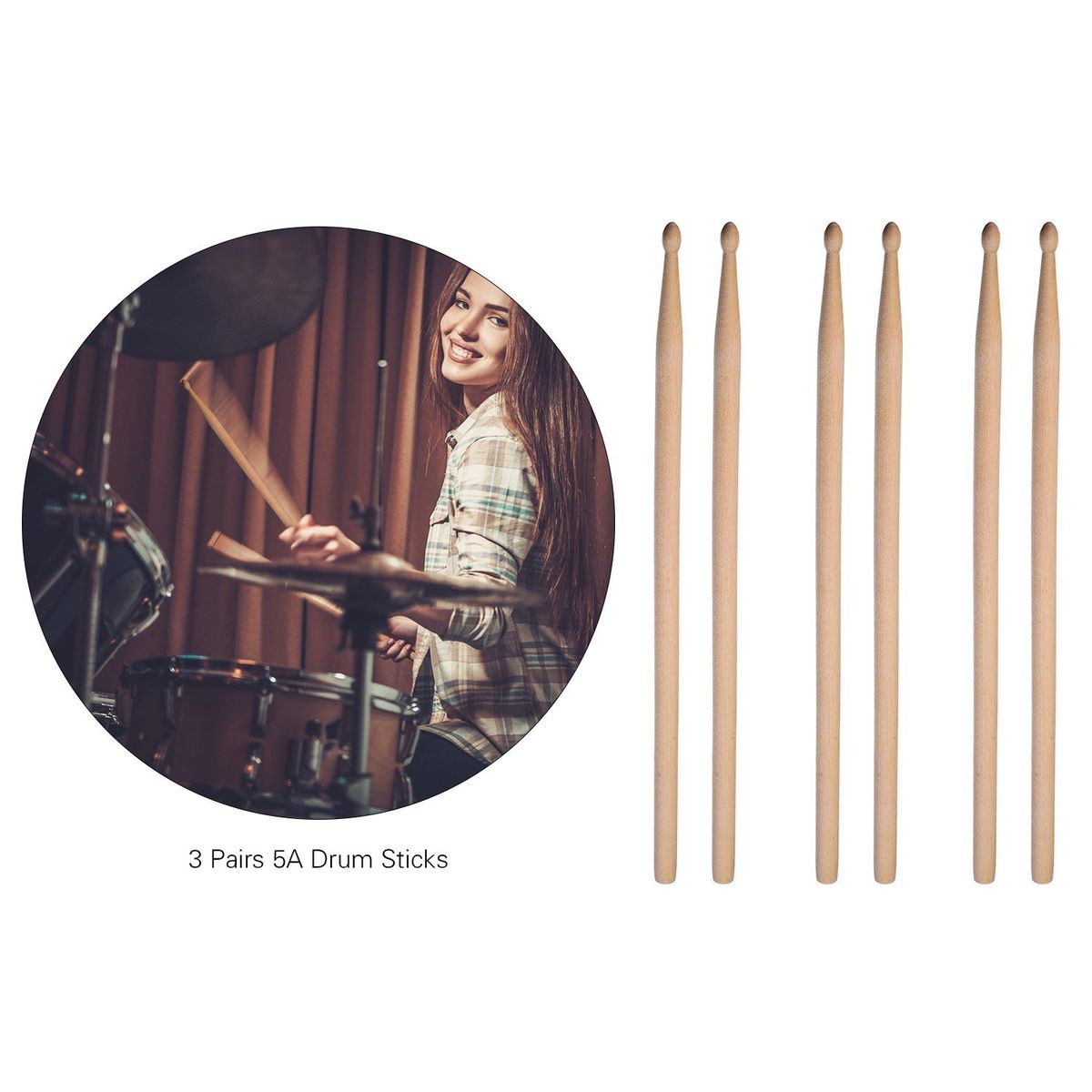 Comes with 3 pairs of 5A drum sticks, which are made of maple wood, solid and durable.