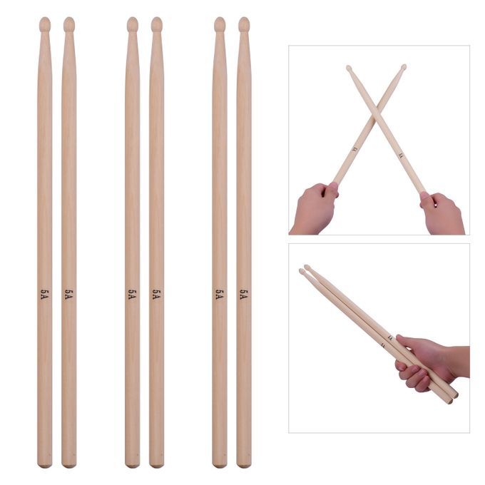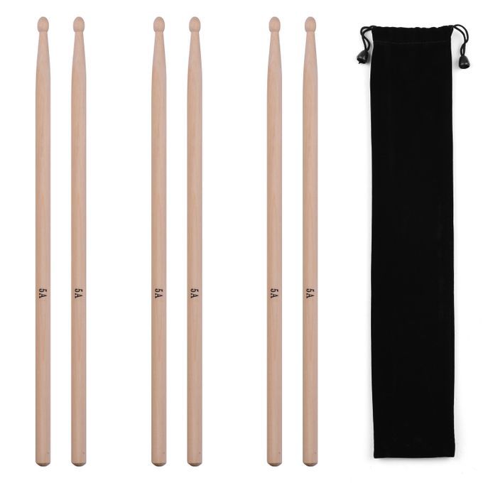 3 pairs of Type-5A drumsticks; ideal for orchestras, rock-n-roll bands, jazz musicians, students, and more.