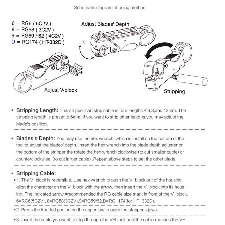 7. Operation: align the end of the cable to be stripped with the end of the stripper, turn it clockwise a few times, and then remove the cable. when stripping the -7 cable, you need to use an allen key to adjust the depth