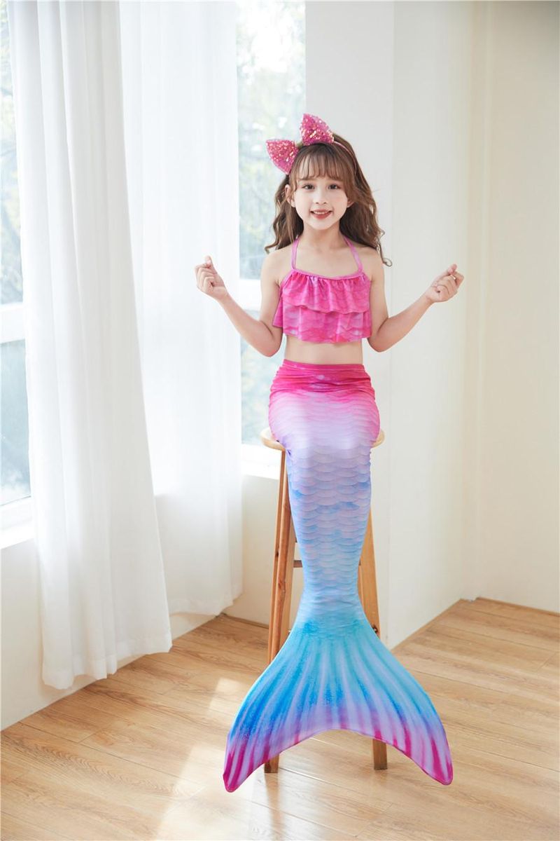 Material: 80% Polyester,Spandex 20%Gender: GirlsSize:(S)100cm, (M)110cm, (L)120cm, (XL)130cm, (XXL)140cmQuantity: 3 Pcs/setLabel: YesWashing Care: Hand wash onlyPackage: 1* Bikini Top + 1* Underwear + 1* Mermaid Tail (NO Monofin Included).