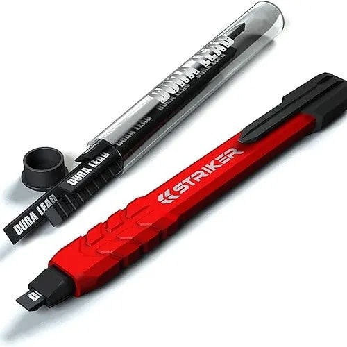The STKR Mechanical Carpenter Pencil is made of high-impact ABS it stays the same length throughout its entire life span has a pocket clip fits in a tool pouch and comes with replacement DURALEAD! Finally no sharpening. When you need more lead just press the cap and release more lead.| A.B.S Body|Replaceable DUARLEAD|Pocket clip|Size: 5.7 in. height x 0.5 in. width|Model# 77579| Replacement DuraLead Available Accessories Replacement Lead.