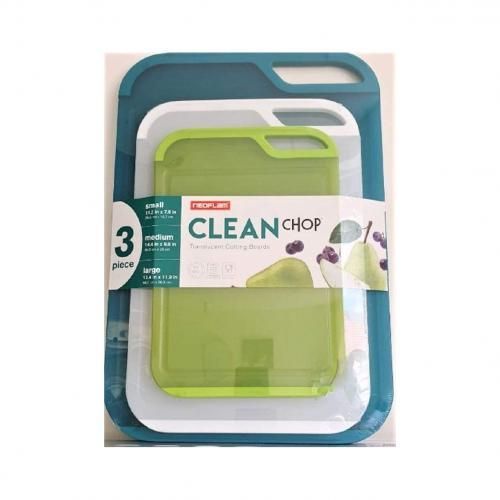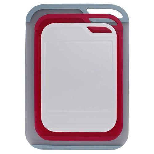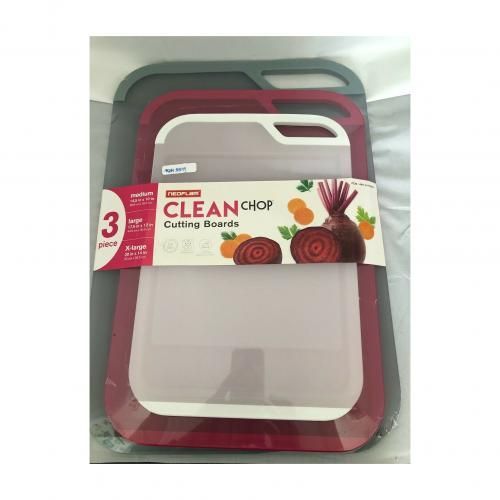 These stylish 3-piece Cutting Boards come in three different sizes. The translucent, plastic boards are perfect for both cutting and serving food. With their stylish design, Neoflam cutting boards are certain to become staple in your kitchen. The large cutting board is the perfect size for serving your holiday turkey! Includes: One medium cutting board (14.5" x 10") One large cutting board (17.5" x 12") One x-large cutting board (20" x 14") Features: Stylish corner handle Knife friendly surface Enlarged juice collection area. Non-slip edges Dishwasher safe Reversible Neoflam Cutting Boards 3 Piece Set features non-slip carry handles for practicality. Double-sided design feature with large juice grooves and nonslip edges to create a friendly work space in the kitchen for all food prep and cooking needs.