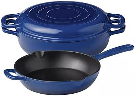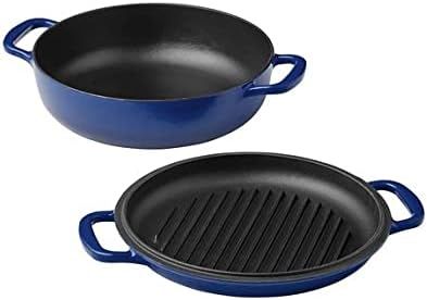 The Member's Mark 3-Piece Enamel Cast Iron Set is a kitchen essential. The set includes a 9" skillet and a 4-quart 2-in-1 grill and cocotte. From a quick pasta al ragu to a low-temperature cooked, savory stew, the round roaster is perfect for cooking a variety of dishes in a single pot.
