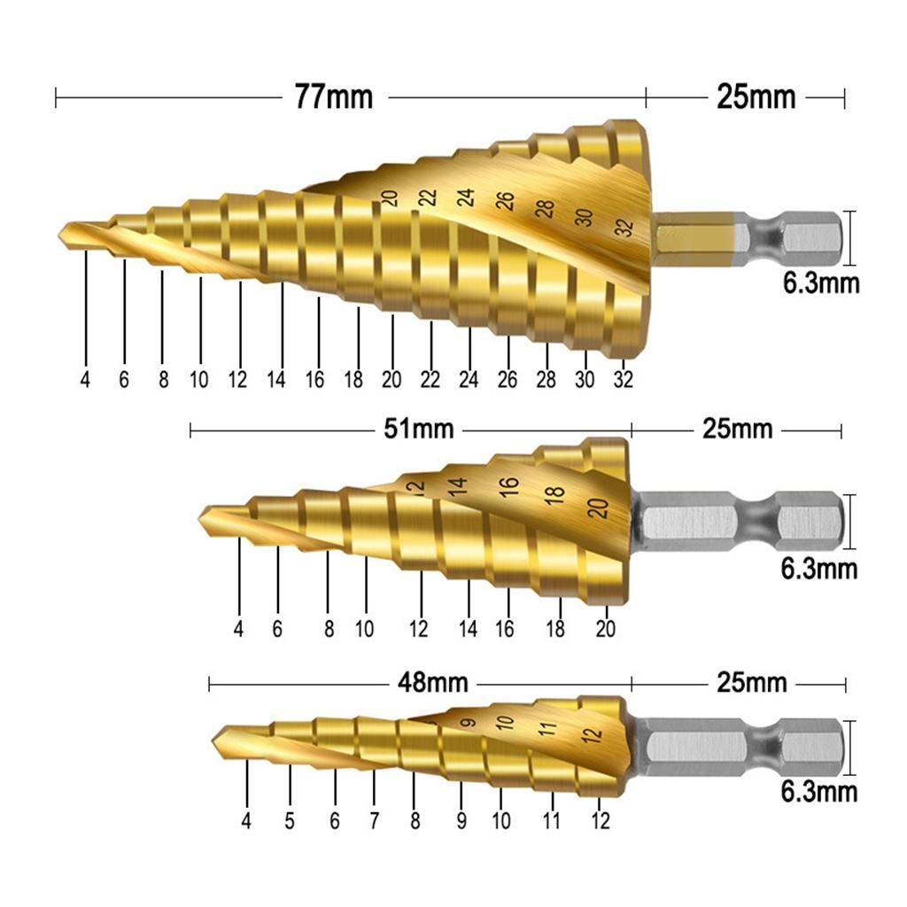 Include: step Drill tool (4-12 / 4-20 / 4-32 mm) + 1 1 storage bag.