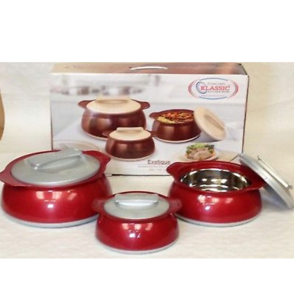 Hot Pot Double Layer Thermos Food Storage Container. Klassic Kitchenware introduces set of three Thermos Food Storage Containers which are made in two layers, outer shell is food grade plastic and inner is high quality stainless steel."Mainly Used to keep Food hot but can be used as a Cold Food Storage. Inner Material is Stainless Steel Bowl. Outer Material is Food Grade Plastic. Keep Food Warms for 4 -5 hours."