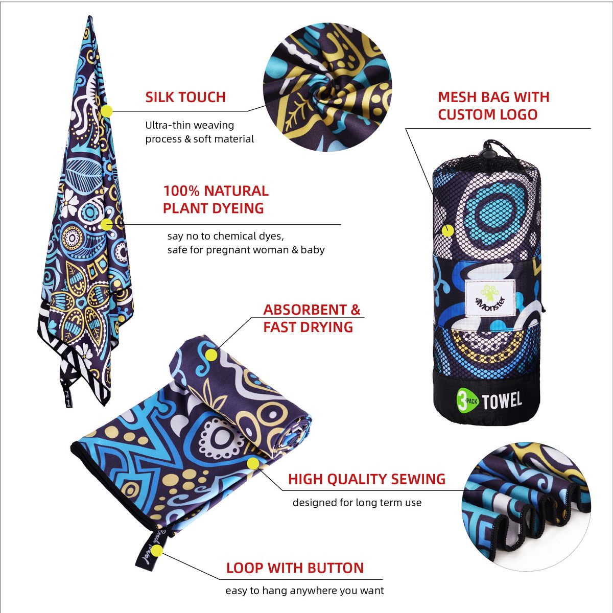 85% polyester & 15% polyamide material,the perfect combination of softness, lightness and strong water absorption.