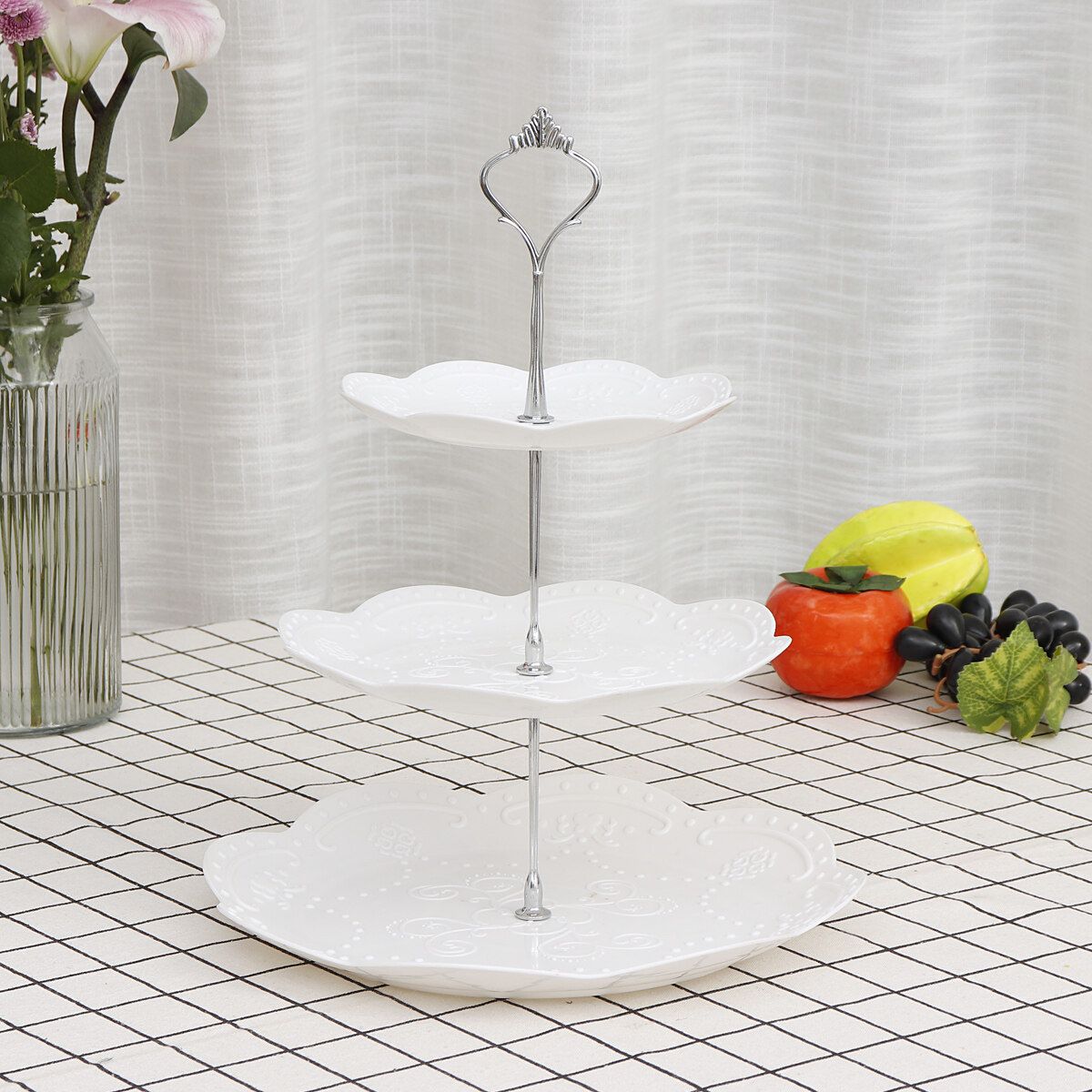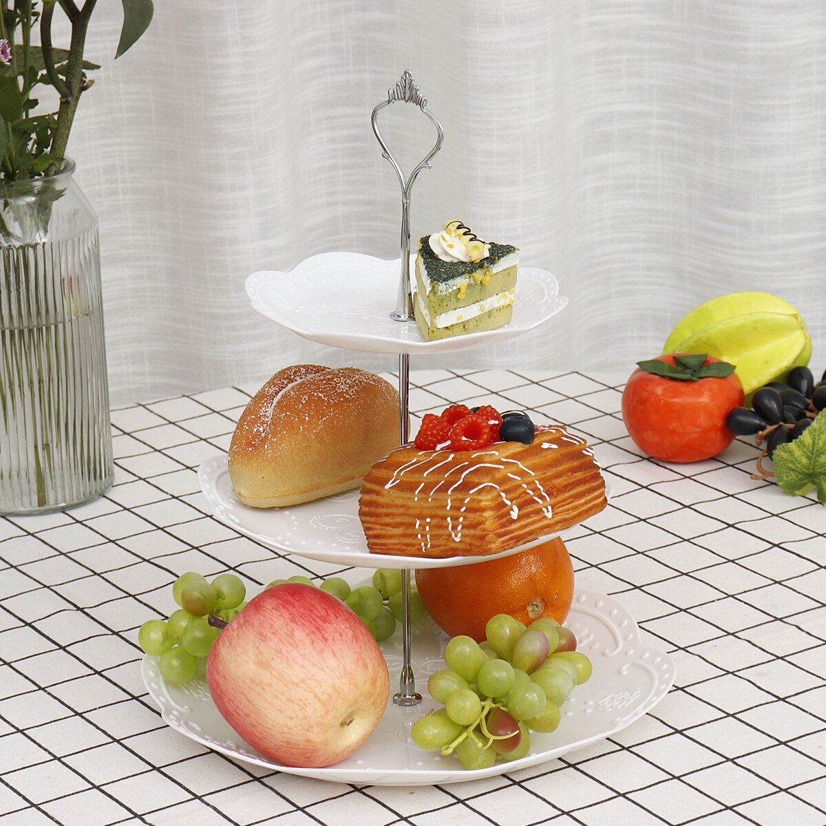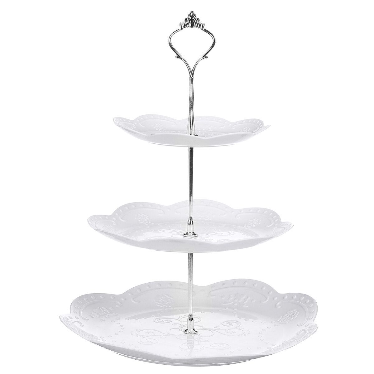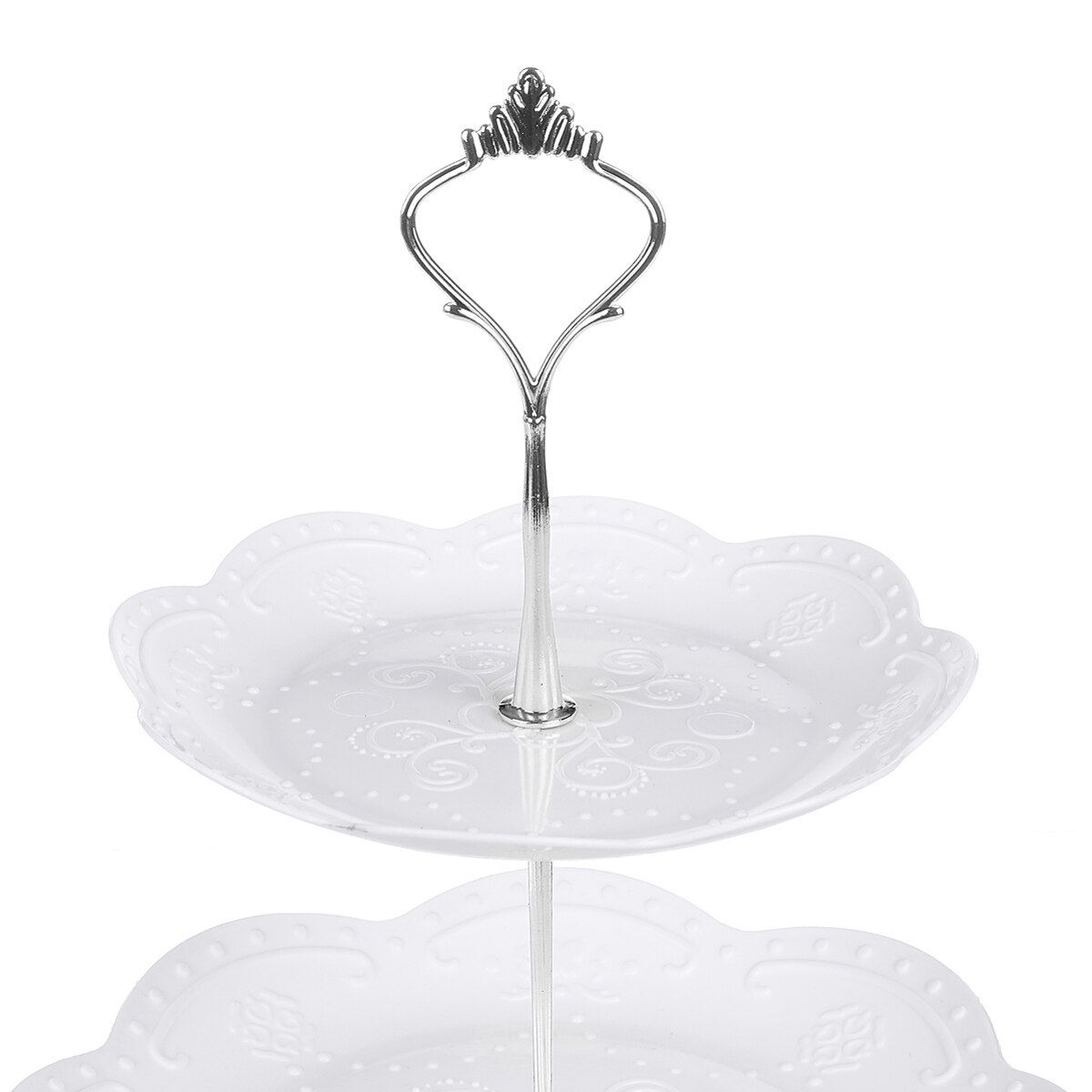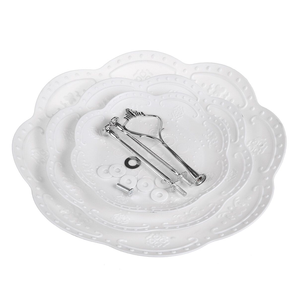 Features:* SAFE MATERIAL: Safety plastic environmental protection material, safe and secure use, durable and not easy to (compared to ceramics). And it is also very easy to clean.* USED IN MANY OCCASIONS: Simple and exquisite design make this cake table stand very ideal for various party celebrations like afternoon tea, graduation ceremony, engagement, wedding, birthday party and more occasions. Perfect for putting a variety of fruits, desserts and cakes.* LARGE BASE AREA: 3-tier different size base to meet various needs of putting cake, desserts, fruit or food, and it will be more convenient to display the food.* STURDY STRUCTURE: This cake table stand has solid structure and good stability. Furthermore, the pull ring design on the top not adds beauty but also very easy to handle the stand.* EASY TO INSTALL: This cake stand is easy to install and no need to use tools.