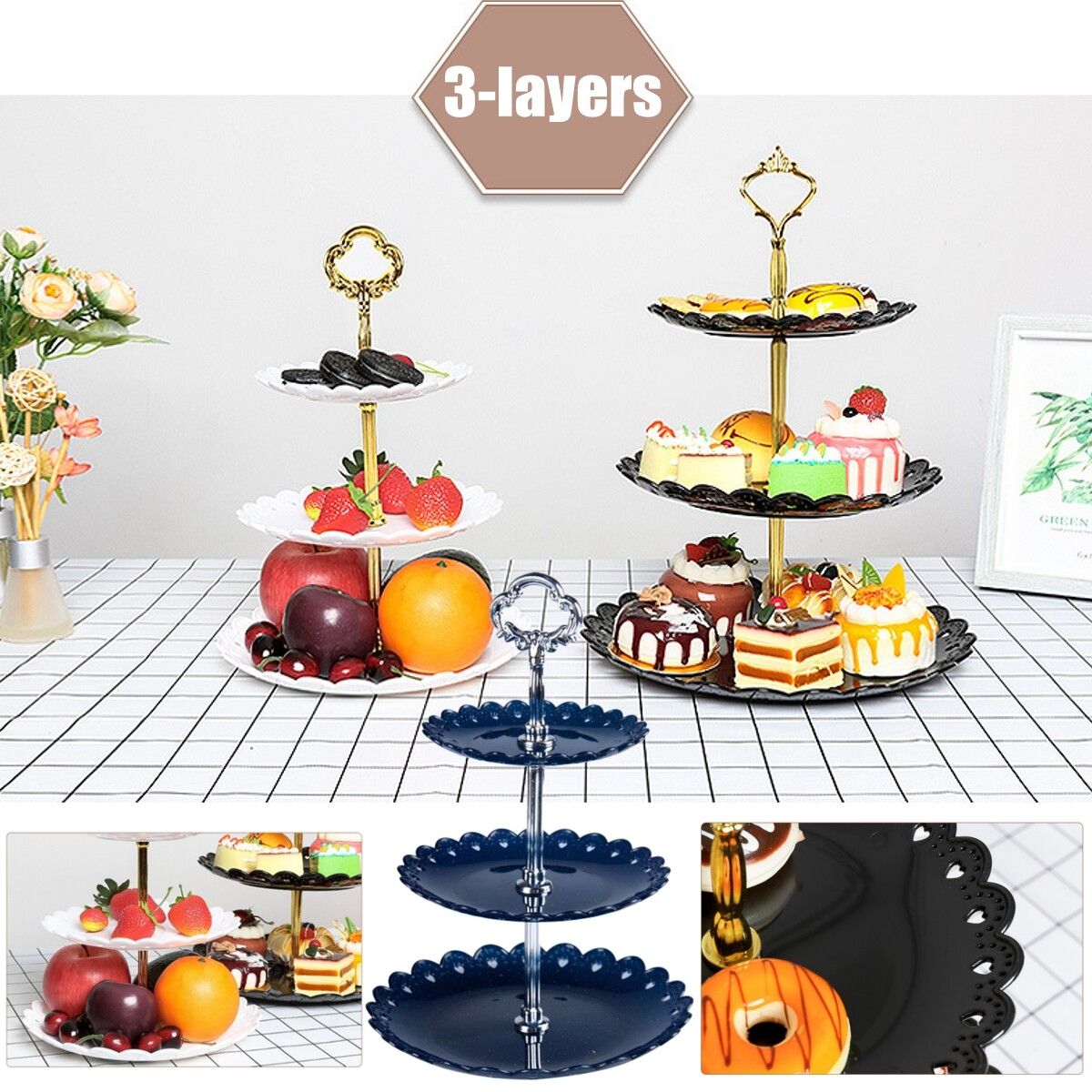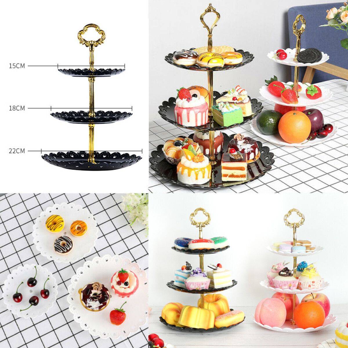 Specifications:: Black/white/blueMaterial: PPApplication: Can show cupcake, snacks, cupcakes, dessert,brownies, finger foods, party appetizers, etc.Plate Size: 15cm/5.9", 18cm/7.1", 22cm/8.7"Height of each layer: 9cm/3.5"Total height: 31cm/12.2"