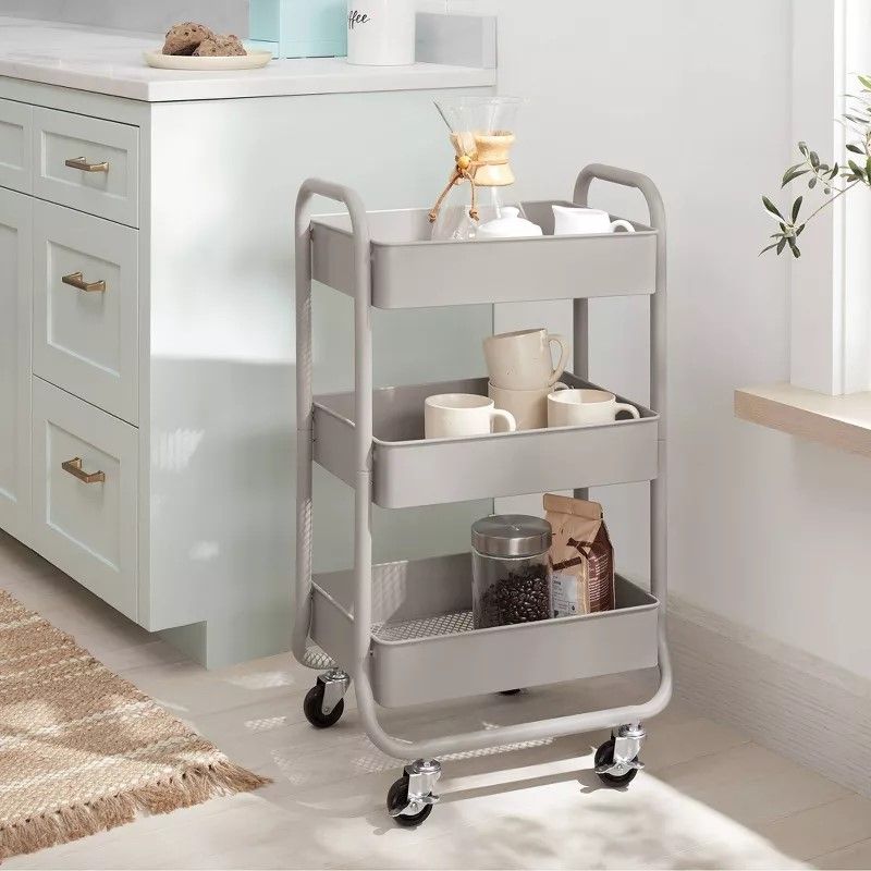 Easily move around the storage space in your home where you need it most with this 3-Tier Metal Utility Cart from Made By Design™. This movable narrow storage cart has three shelves with lips around the edges to make sure items are secure as it's wheeled around. Two curved handles on the top make it comfortable to push around, while the four caster wheels have the ability to lock in place for secure use when it's stationary. With mesh bottoms on the shelves that provide breathability for linens or towels, this slim wheeled storage cart is the perfect functional storage solution for your home. For easy storage and transportation as tools cart, serving cart, organization rack in kitchen, garage, bathroom, patio, courtyard, dining room, etc.