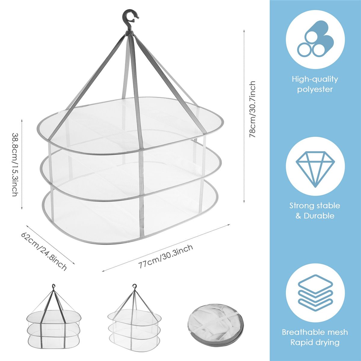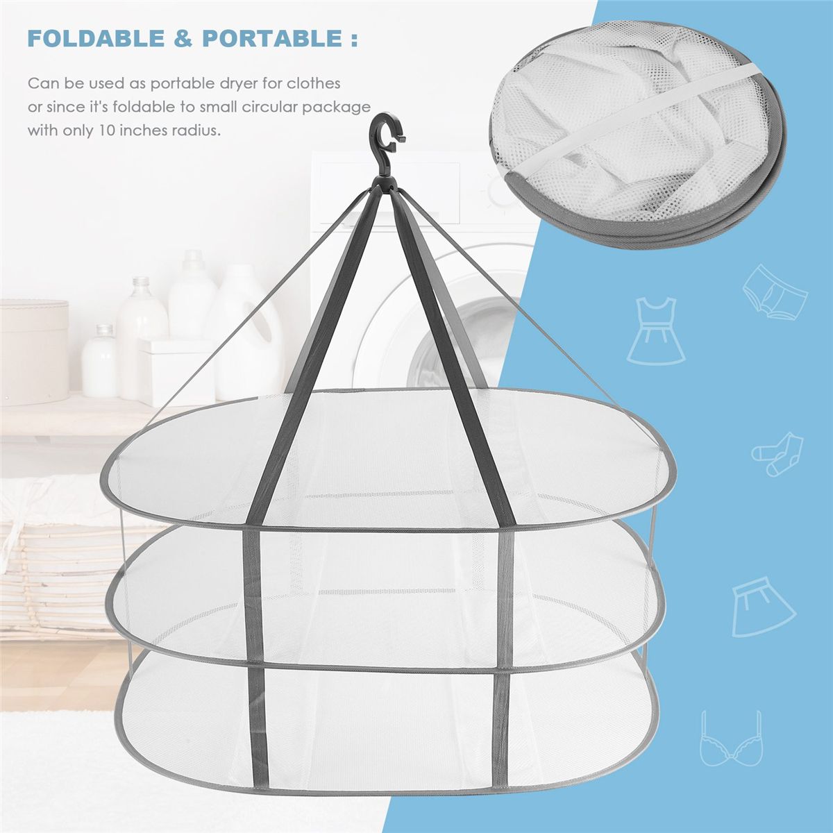 Can be used as portable dryer for clothes or since it's foldable to small circular package with only 10 inches radius