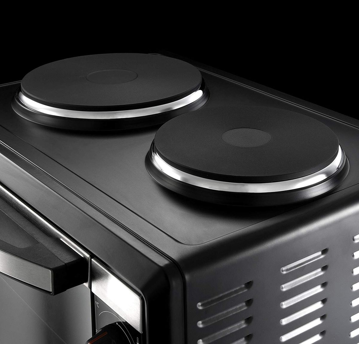 Multi-function electric compact cooker with hot plates so you can grill, roast, bake, fry and boil (oven and hotplates cannot be used at the same time)