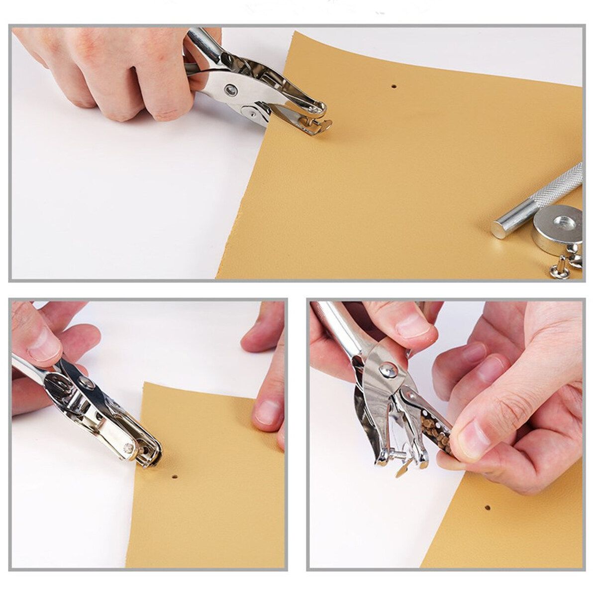 Specification:Base : Fixed rivets to prevent movementFixing rod: makes installation easier and does not damage rivetsPunching Pliers: It's suitable for leather.: Gold + Silver + BronzeSize: 6x6mm /8x8MM /8x12mmMaterial: Metal