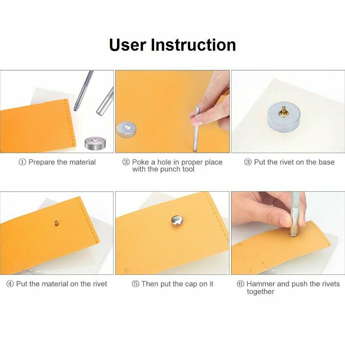 Note:1.These leather rivets are small items, please keep them away from children to avoid choking by mistakes.2. the above package content, products are not included.3.Light shooting and different displays may cause the of the item in the picture a little different from the real thing. The measurement allowed error is +/- 1-3cm.How to use1.Prepare the material2.Poke a hole in proper place with the punch tool3.Has already made a hole4.Put the material on the rivet5. put the cap on it6.Then hammer and push the rivets together7.Complete a good front8.Finished a good back