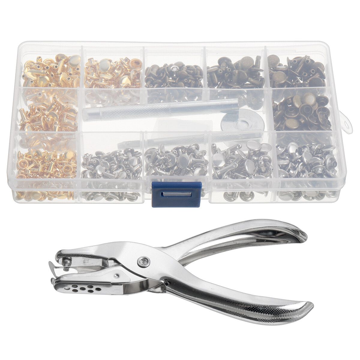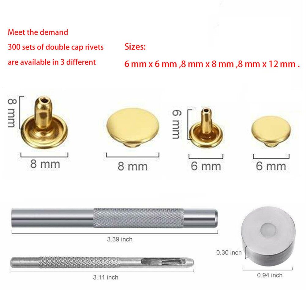 Features:1.Good quality: Rivets for leather and install tools are made of durable iron, Not easily deformed and .The smooth surface of the rivets is plated in 3 colors, are fashionable and not easy to fade or rust.2.Easy to use: This leather rivets kit provides you with 4 auxiliary tools that are designed to hold the rivets to prevent movement and make the installation simpler, allowing the rivets to be flat after installation.3.Widely use: Rivets for leather work are useful tools for DIY crafts or clothing such as wristband, hats, jeans, windbreakers, belts, shoes, down jackets, jackets and so on.3.Practical storage boxAllows you to quickly find the size and of the leather rivets double cap you need; easy to store to prevent loss of rivets; saves space and time.4.Meet the demand: 300 sets of double cap rivets are available in 3 different sizes:6 mm x 6 mm ,8 mm x 8 mm ,8 mm x 12 mm ,for leather and crafts of various thicknesses; 3 different colors to meet the needs of different crafts.Punch rod , Hand punch pliers : Simplifies punching and saves time