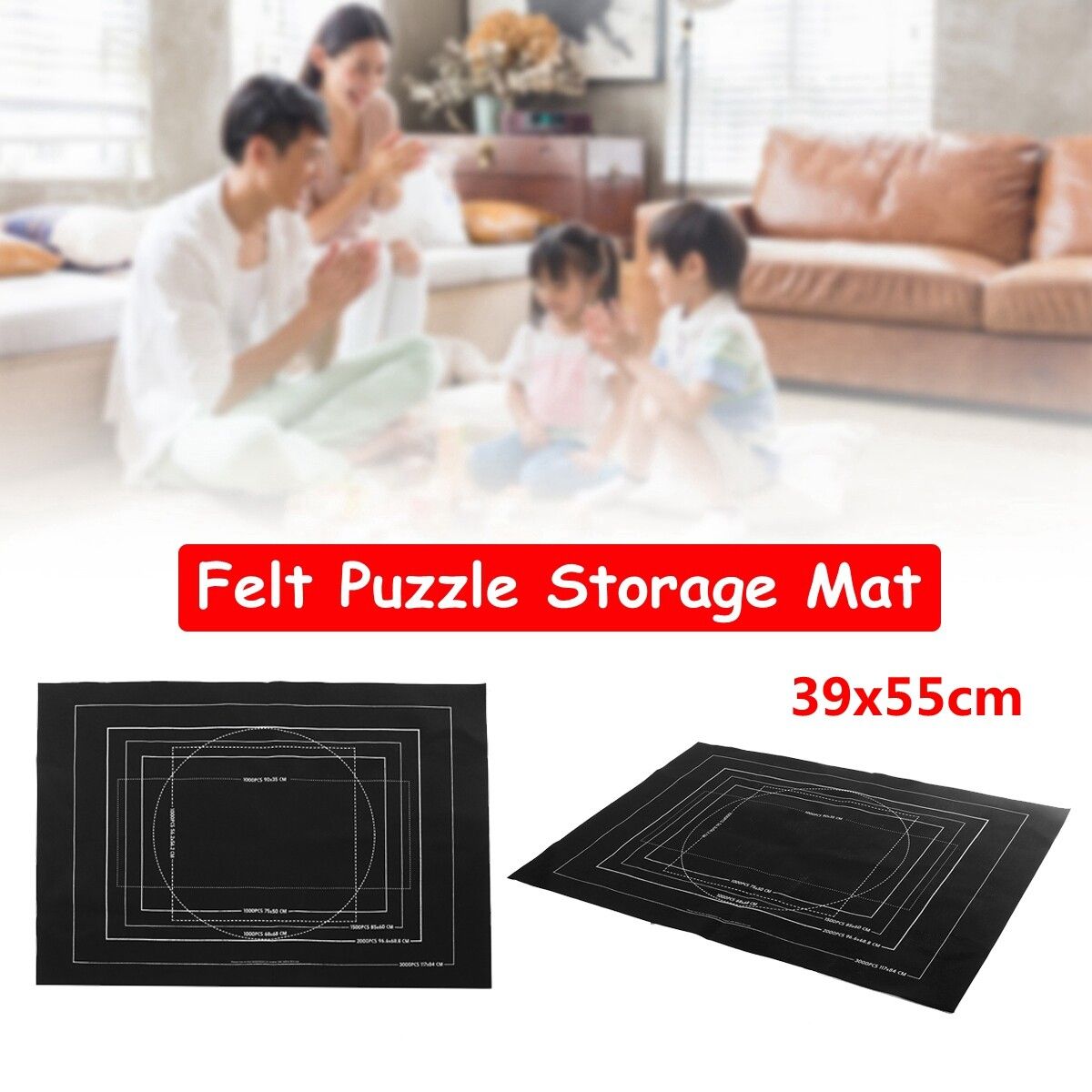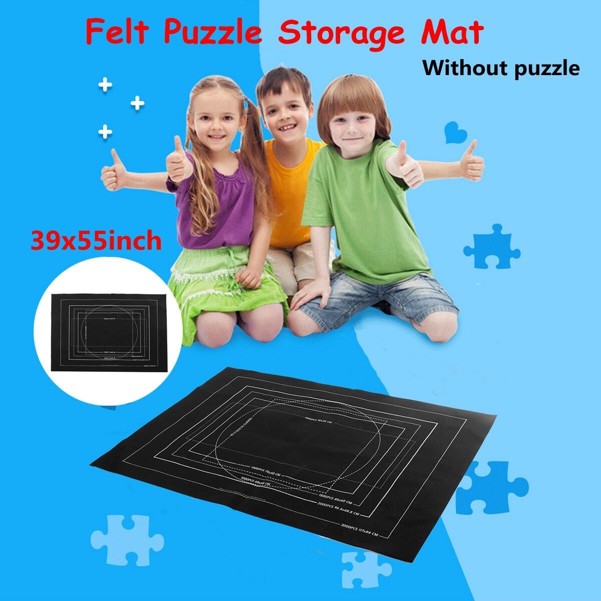 Specification::BlackMaterial: FeltSize: about 39x55 inch[Conversion: 1cm=0.3937 inch, 1inch=2.54 cm]For up to 3000 pieces puzzle.Package Included:1*Felt Mat1*packing bag(Warm tips:Puzzles Not included.)