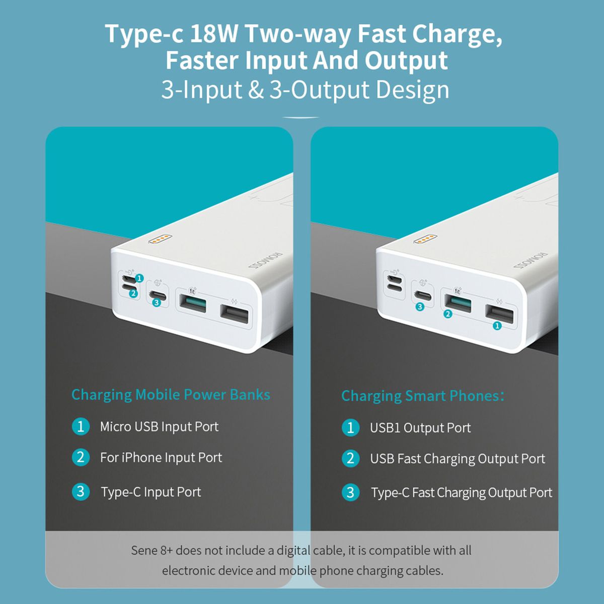 · -CABLE IS NOT INCLUDED - This portable charger can be charged with any of 3 types of cables (Micro USB/L i g h t n i n g/Type-C) you're using for your device. Designed with the purpose of environment protection, CABLE IS NOT INCLUDED.