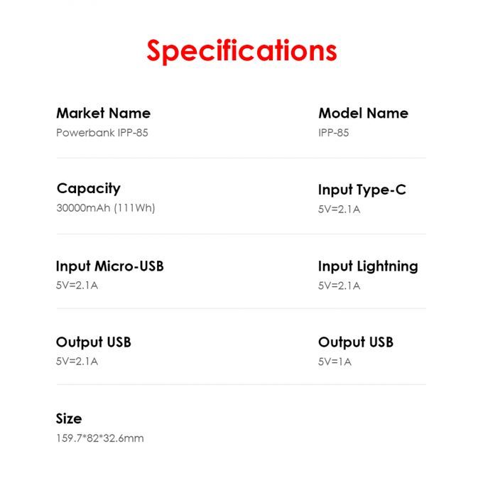 Battery Cell Type: Lithium BatteryCapacity: 30,000mAhRated Input: DC 5.0V, 2.1ARated Output: DC 5.0V - 2.1A , 5.0V - 1A