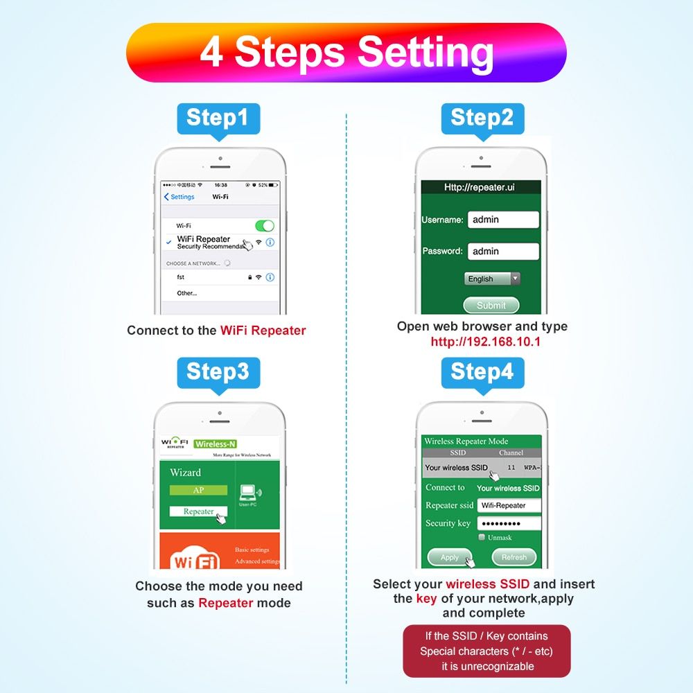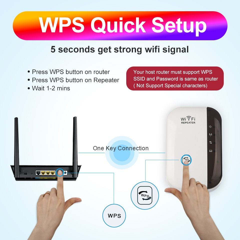 Quick & Easy set up -Only takes 10 seconds! This Extender Wifi Repeater easily extend wireless coverage by pressing the WPS button; Or set up via browser website based configuration in almost any device, including iOS and Android mobile platforms. If Choose Repeater mode,The wifi repeater's password keep the same as your host Router's Wifi key,What's more ,if your router's password has special characters,please revise it before setting up the wifi repeater.
