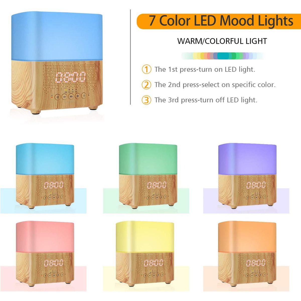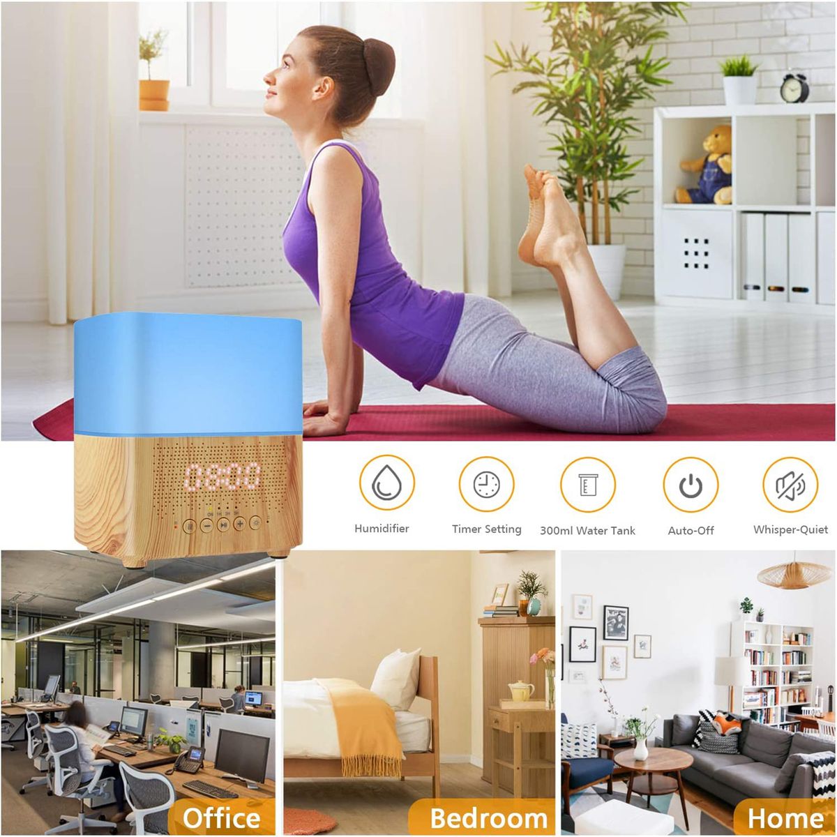 It is a multi-functional aroma diffuser that combines ultrasonic air humidifier, LED 7-color ambient light, Bluetooth speaker, clock, and alarm clock in one. The capacity of the diffuser tank is 300ml, the body is designed with wood grain, to fit a minimalist decoration, perfect for bedroom, nursery, living room, washroom, office, hotel, beauty salon, also suitable for yoga.