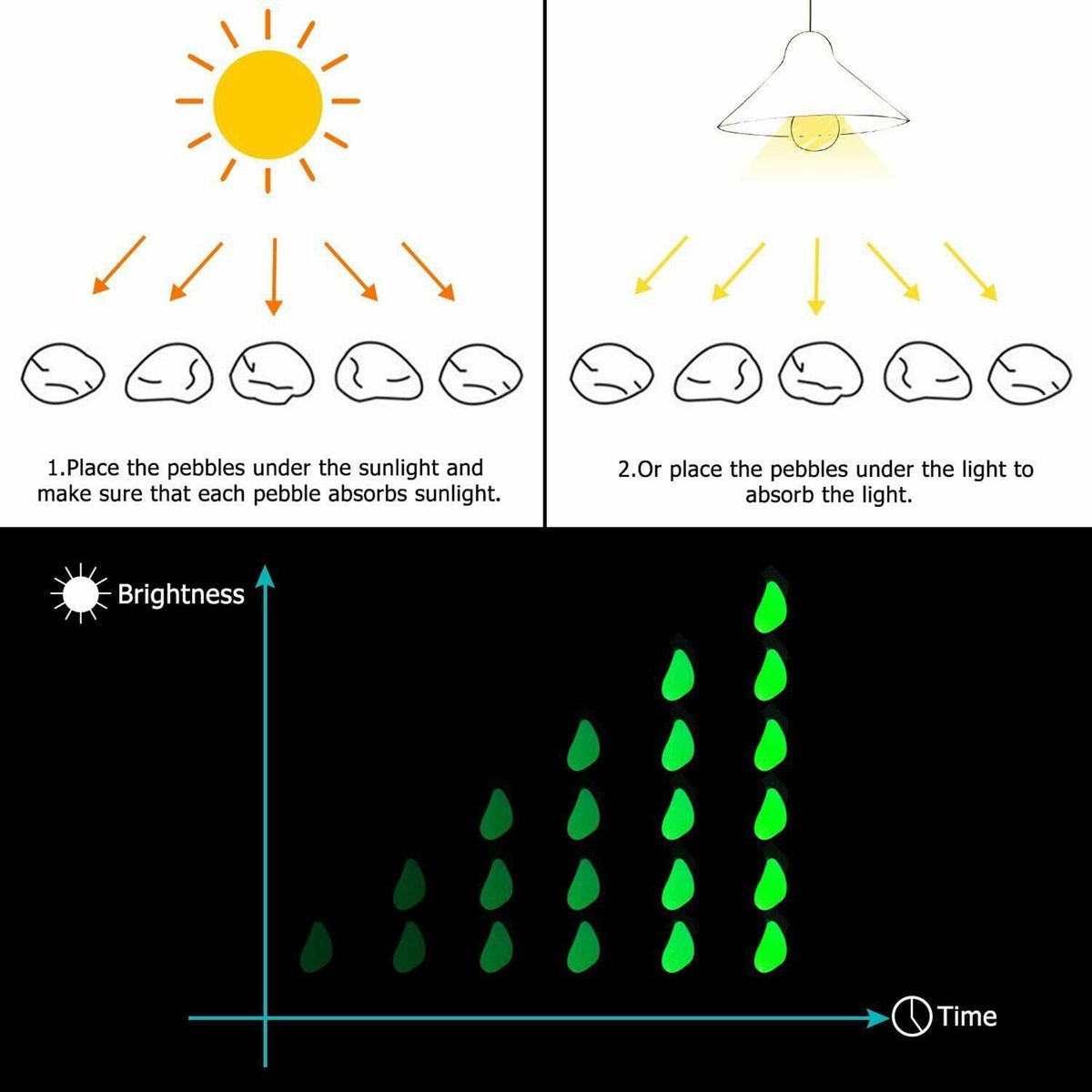 Features:No electricity required, just put pebbles in the sun for half an hour or more, it will glow in the dark.