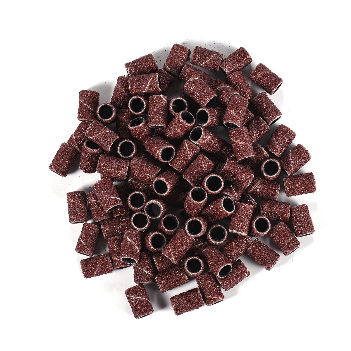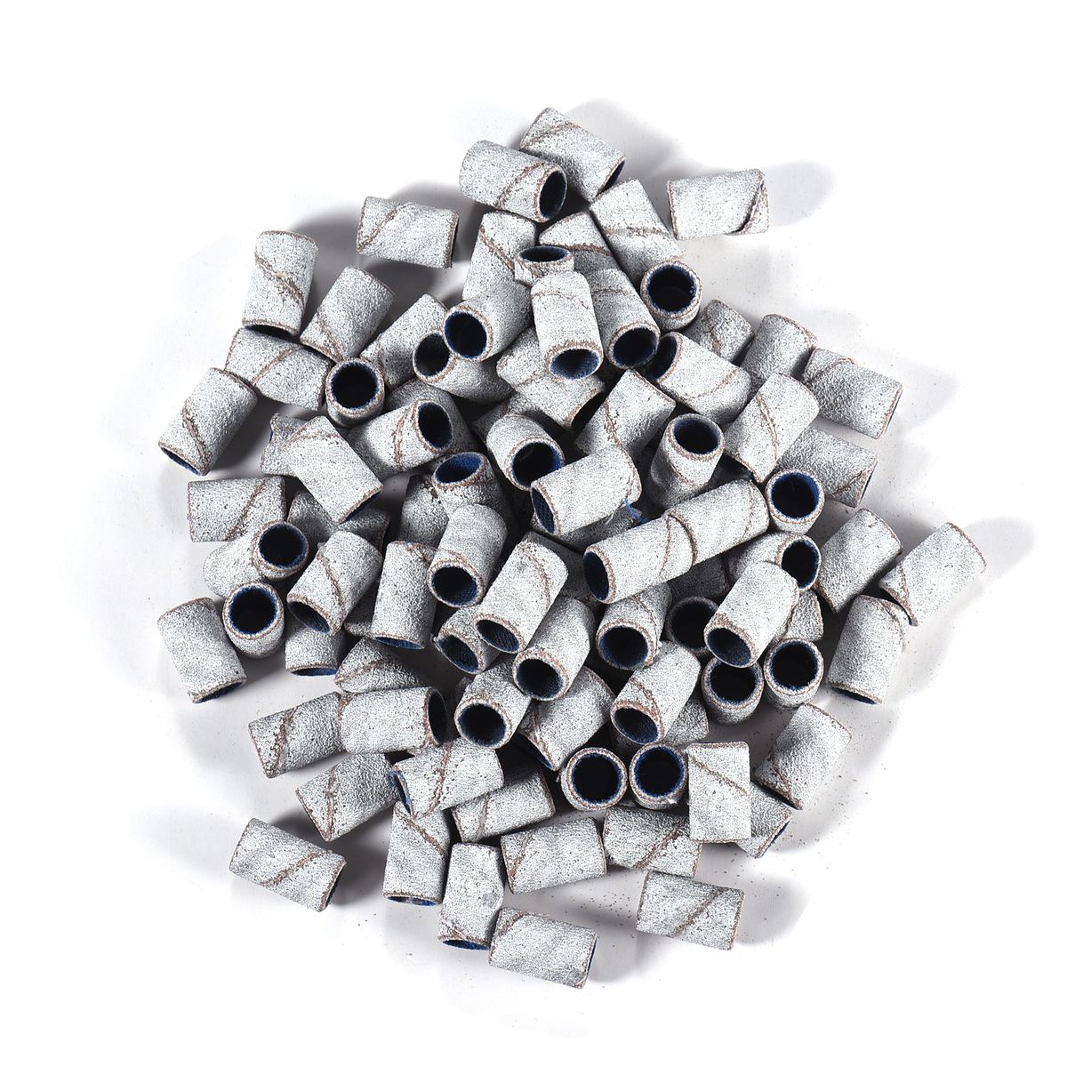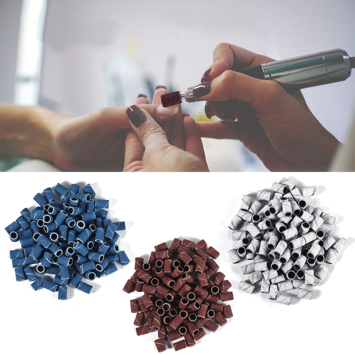 100pcs coarse grit 80#; 100pcs medium grit 120#; 100pcs fine grit 180#. Comes with 3/32" nail drill bits. Insert the manicure sanding band over the drill bit, then you can ready to nail art.
