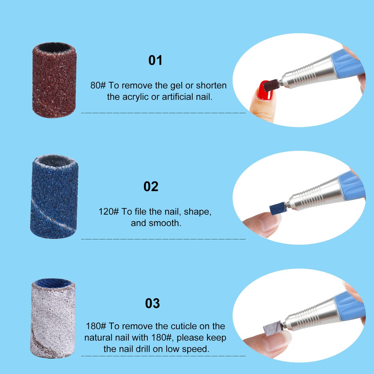 Use 80# to remove the gels or shorten the acrylic or artificial nail; 120# can file the nail, shape, and smooth; then remove the cuticle on the natural nail with 180#, please keep the nail drill on low speed.