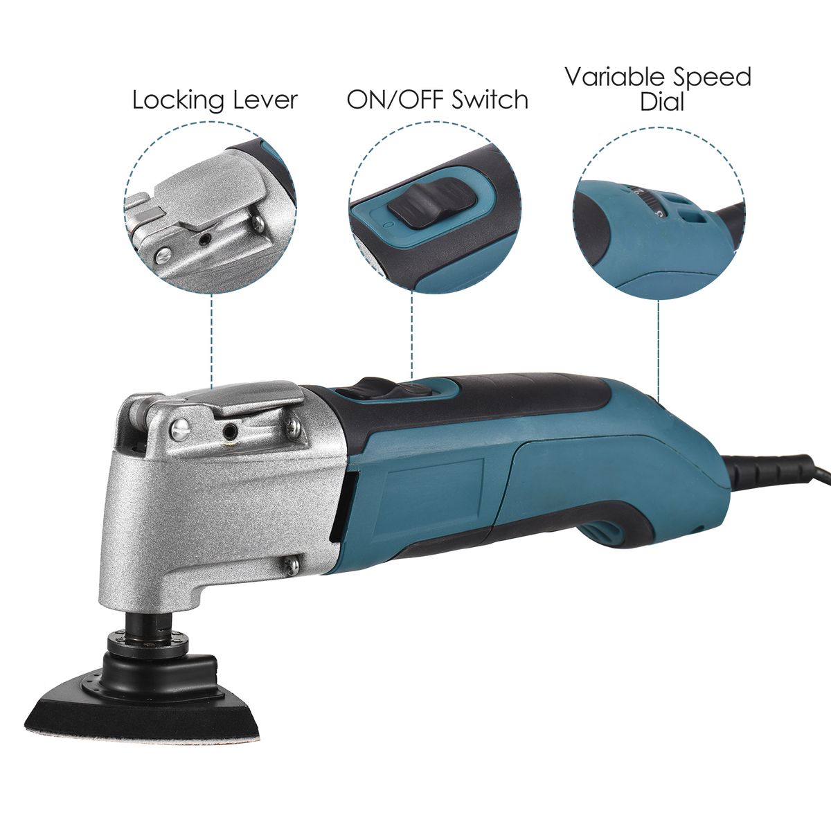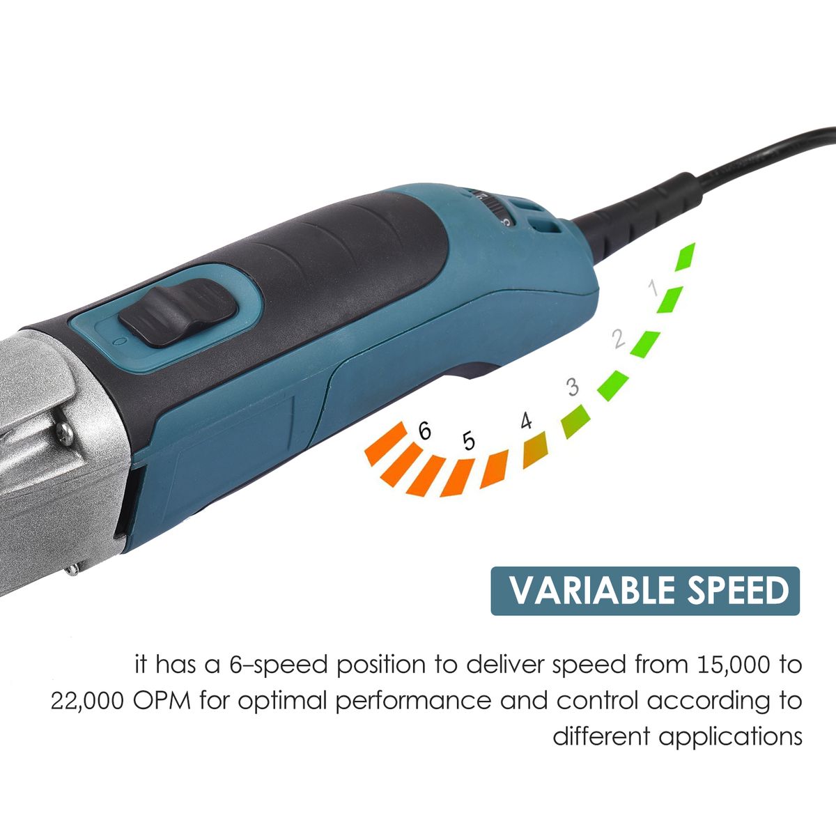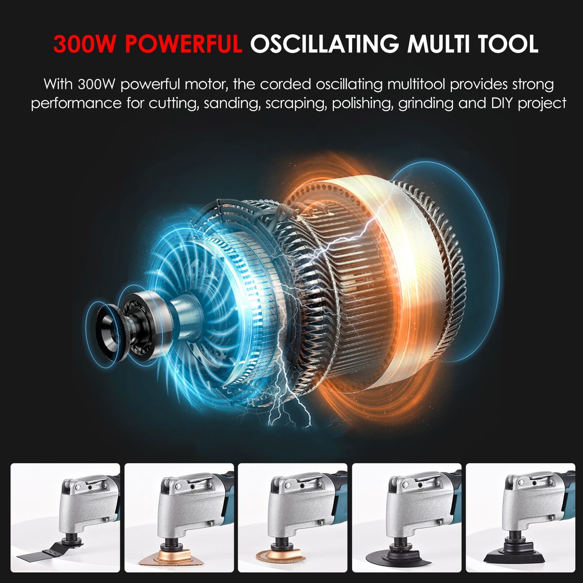 300W Powerful Oscillating Multi Tool: with 300W powerful motor, the corded oscillating multitool provides strong performance for cutting, sanding, scraping, polishing, grinding and DIY project.