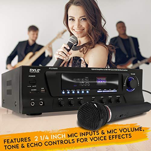 Details: - Auto Station Seek - A/B Speaker Output - -0V Swithable - USB/SD Card MP3 Player - Radio Station Memory - Inputs: RCA (1 Audio Soure) - Total Power Output: 0 Watt - AM/FM Quartz Synthesized Tuner - Separate Subwoofer Gain Controls - Digital Fluoresent Output Display Meter - Mirophone Volume, Tone & Eho Controls - 2 Mono RCA Dediated for Subwoofer Output - Outputs: Banana Bbinding Post (to Speakers) - iPod / MP3 Input with Inluded Connetion Cable - iPod Doking Station, Suitable for All iPod & iPhone Models - (USB, SD Memory & iPod Not Inluded) - 1 Watt x 2 8 Ohms - 175 Watt x 2 4 Ohms