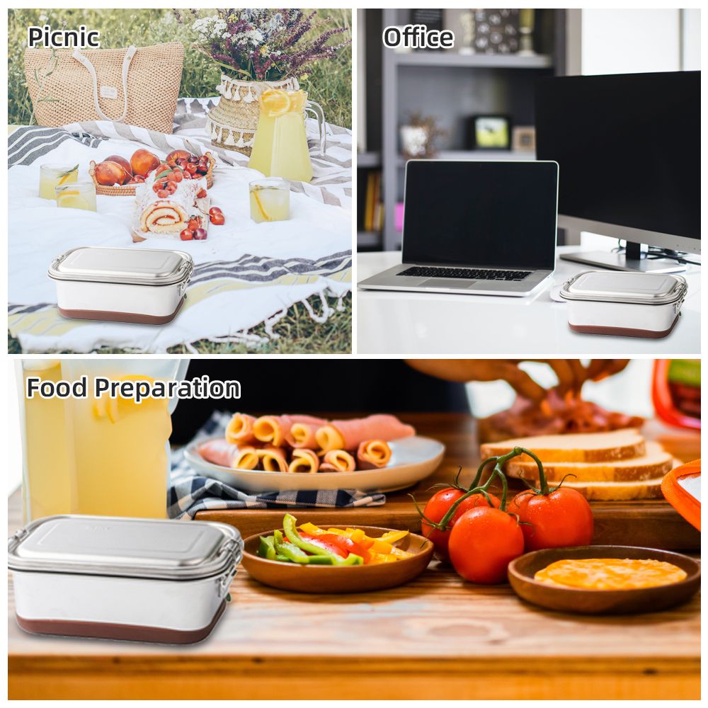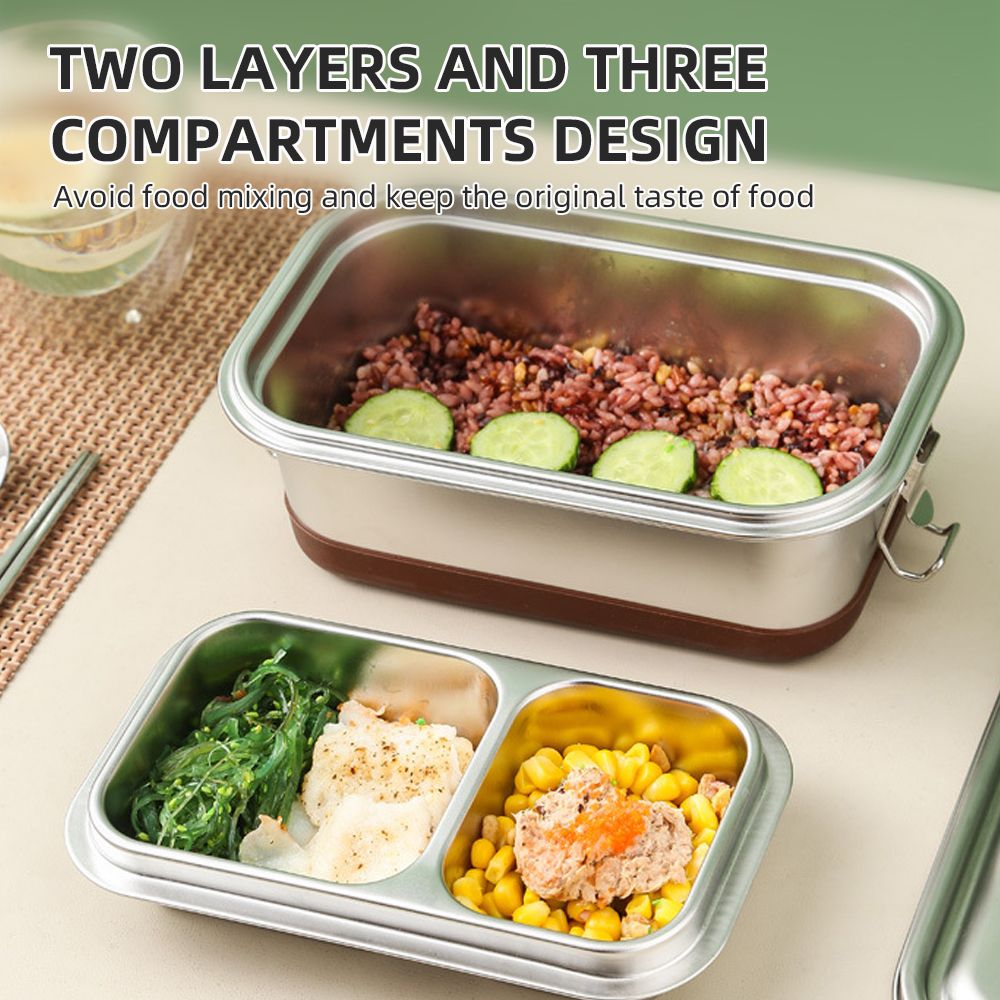 Description:Made of food grade 304 stainless steel, this lunch container provides large capacity to pack a sandwich or wrap other food and fruits. Ideal for hiking, camping, picnic and other occasions. Double layers and three compartments design are adopted to avoid food mixing. With silicone sealing ring as well as double locking buckles, you can safely put it in the bag without worrying of leakage. Dishwasher and refrigerator safety are available.
