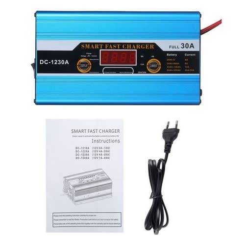 This battery charger uses micro MCU controller to manage the process of the battery charging.The charger will automatically stop charging when it is getting fully charged.This battery charger uses three-phase charging mode(PWM charging mode), which includes constant current charging phase, constant voltage charging phase, floating charging phase.With online battery detection, short circuit protection, over voltage protection, Anti - reverse connecting protection, etc.The smart charging indicator shows charging process directly, which facilitates users to manage the current of the battery.Three-phase charging modeConstant current mode:When the voltage of the battery is lower than the value set by the charger, the charger will work under the constant current mode and supply the constant current to the battery.Constant voltage mode:Using the pulse width modulation(PWM) tech to control the charging current and output voltage of the charger which ensures the battery is fully charged and avoids over charging.Floating charge mode:When the voltage of the battery is approaching the value of the constant voltage mode, and the current will cut down to the given current gradually, that means the battery power is full, then the pilot lamp will turn green and the fan will stop working. The charger will turn the mode into floating charge mode automatically. At this moment, the battery can be stopped charging or keep on floating charge for half an hour.Come with EU plug to US plug adapter converter, it is convenient for you to charge.