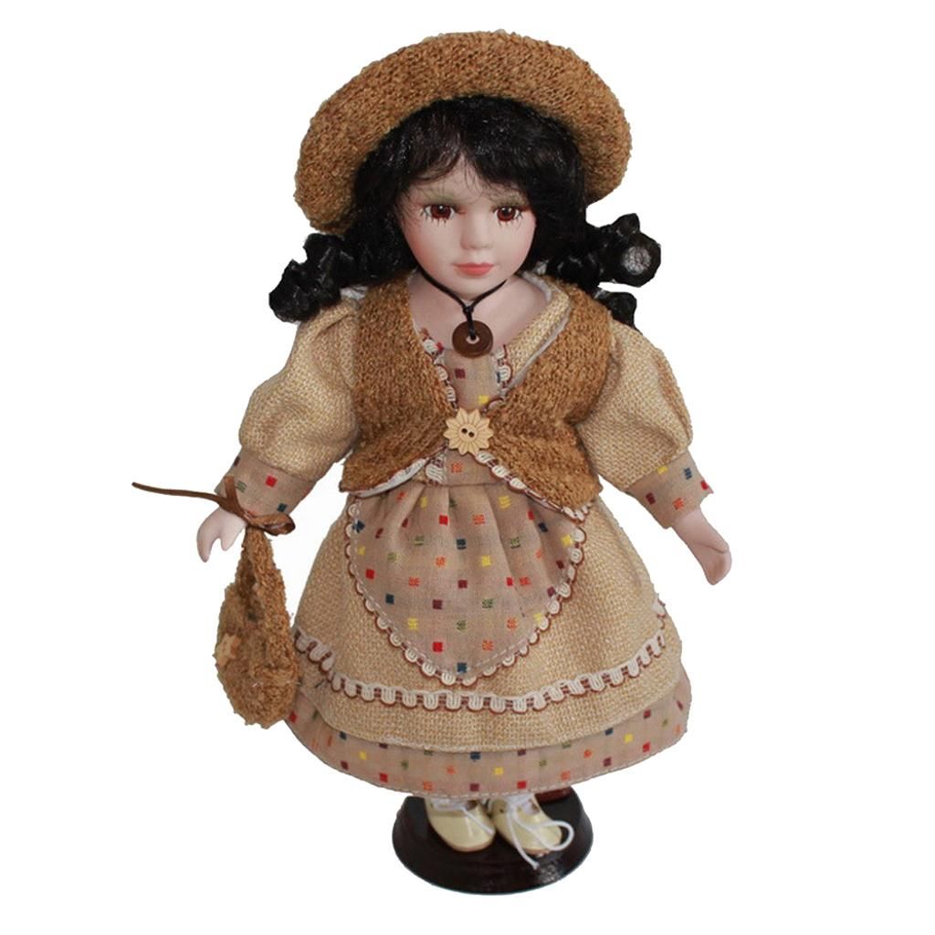 Lovely girl dolls wearing beige dress suit with black hair, hat, handbag, shoes and metal stand handicraft home decorationSuit to be collect gift and collocate lives in adornment, showing style and interestBeautifully designed and crafted with excellent workmanshipThis doll is not only a toy, but also a fine collectible to be enjoyed by collectorsMaterial: Porcelain, ClothMain Color: Beige