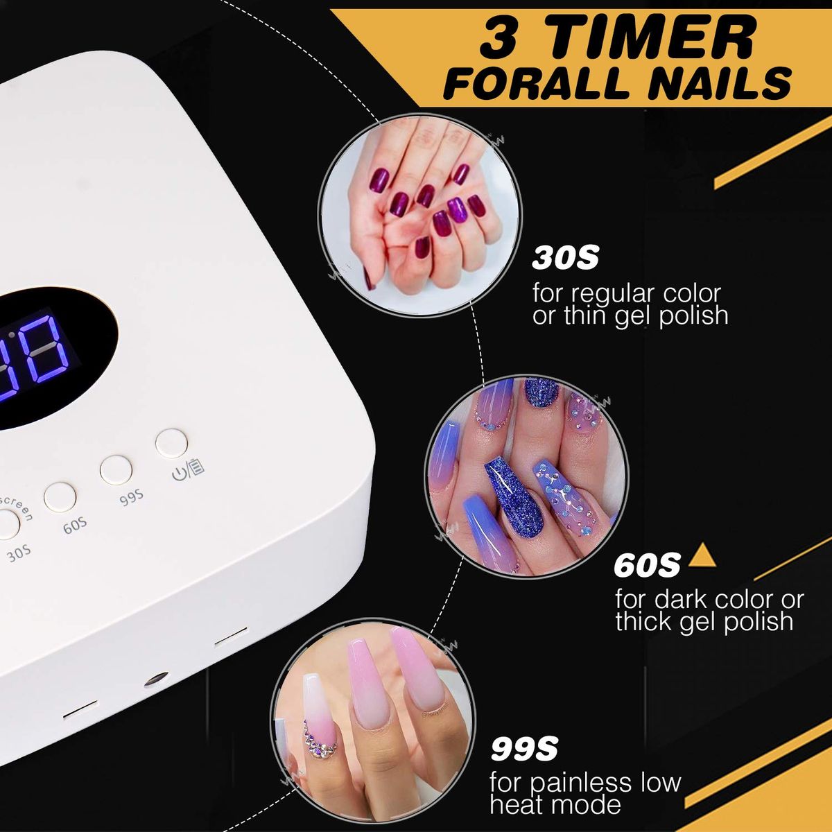 30S: for regular color or thin polish 60S: for dark color or thick polish 99S: for painle low heat mode