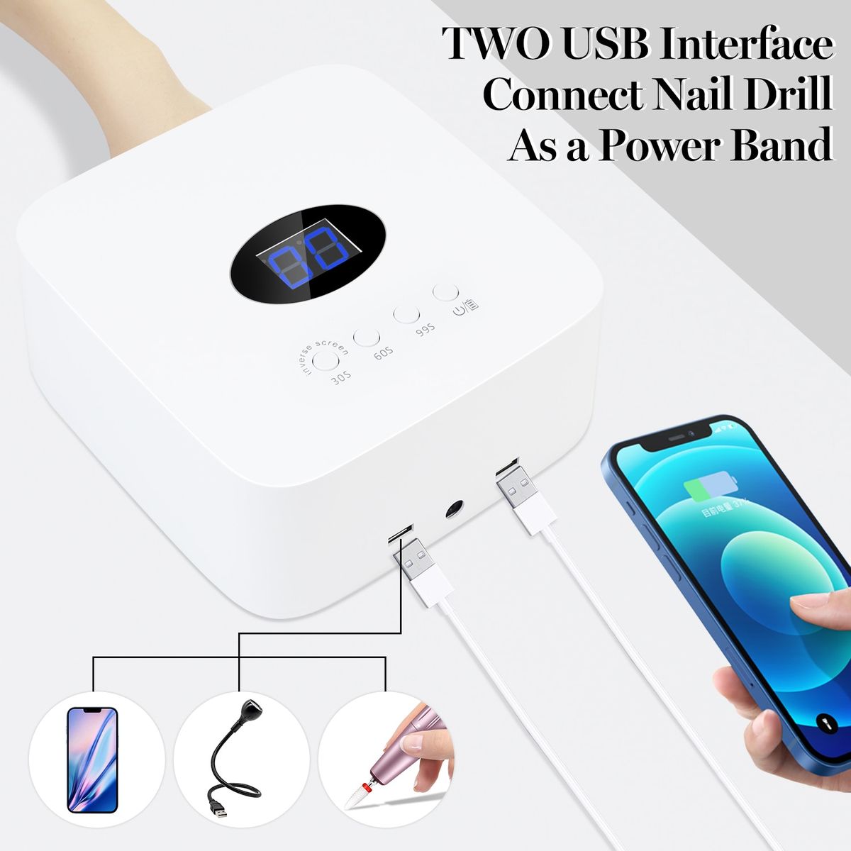 【30LEDs】Dual light source can dry most UV and LED polishes; high power provides instant drying, say no to boring waiting time; 30pcs lamp beads are evenly distributed for all-directional drying. 【Rechargeable Cordle Nail Dryer】 Dual USB power of this UV nail lamp supply portable nail drill, mobile phone charging, USB lighting, no need other chargers and the wall socket, multi-purpose machine, strong practicability, can be use without wire. 【Removable & Protect Your Eyes】 The detachable base is easy to clean and keep sanitary. It has paed FC/CE/ROHS certification, reliable quality, and it's safer than others because it removed all harmful light, no harm to your skin and eyes. 【3 Timing Mode & Automatic Intelligent Induction Timing】 UV nail with lamp screen supports automatic intelligent induction timing and 3 kinds of the manual countdown (30S/60S/99S). Support inverse screen, the screen number can be displayed upside down, it is a very user-friendly design for manicurists and customers. 【Easy to use】This cordle nail lamp is rechargeable and portable design, Built-in battery support cordle and free operation, can continuously working 10 hours ar fully charging it only 3 hours. Has a battery indicator and battery shortage remind function; DIY at home or going out nail art, this wirele UV nail dryer is the best choice.