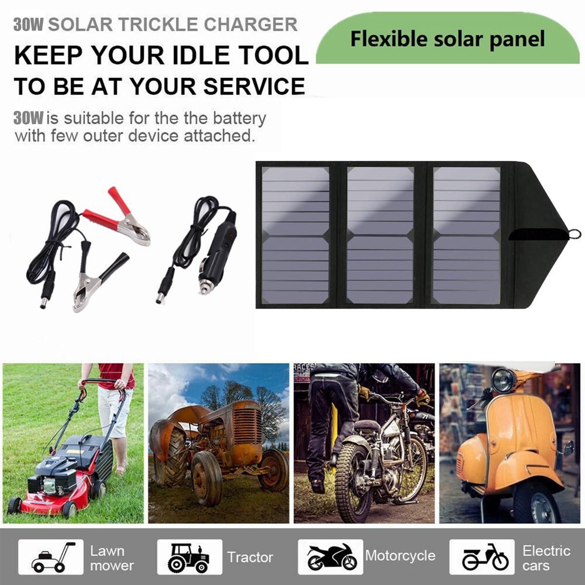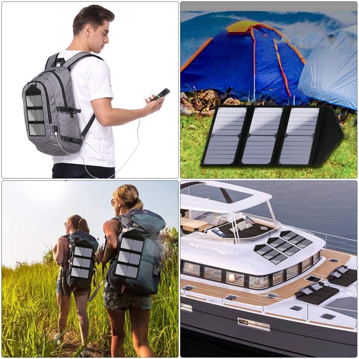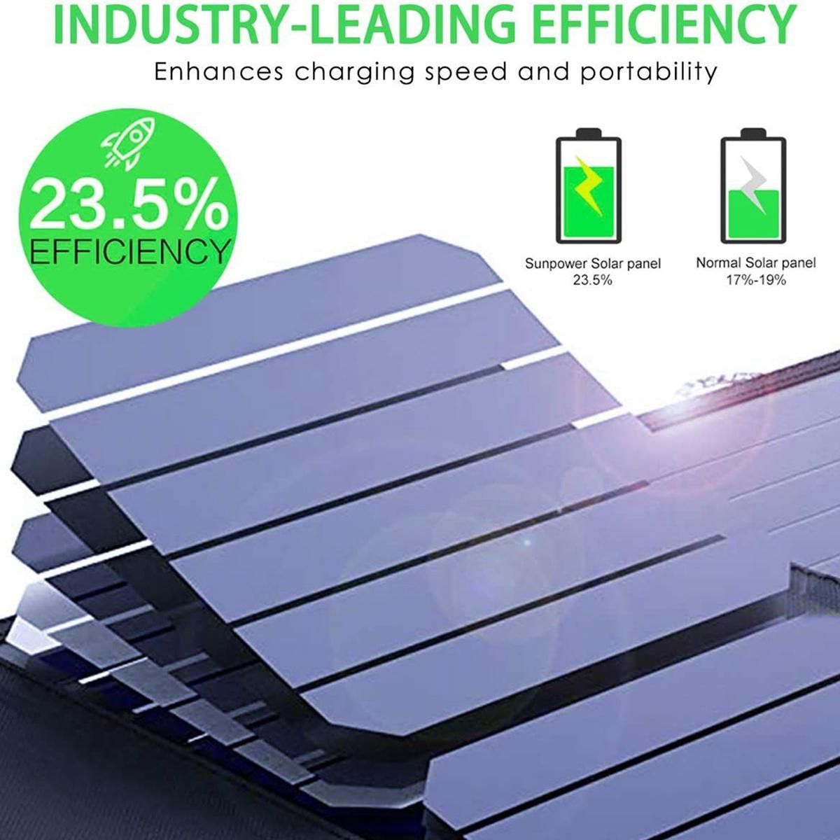 2 Fast charging technology PowerIQ can fast charging up to 2 amperes in direct sunlight The efficiency of 30W solar array is 215-235% providing enough power to charge two devices at the same time The charging speed is increased by 4 It is also backward compatible with QC 20 QC10 and standard USB charging With advanced charging efficiency and reduced charging heat the solar panel is the perfect power supply for your journey