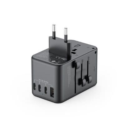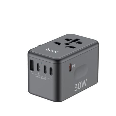 ALL IN ONE WORLD TRAVEL ADPTERBUDI universal travel adapter has built in US//JP, AU, EU, UK Sockets, covering more than 150 countries, It has an ADVANCED GaN technologyequipped with 4 USB- C PORTS, 1 USB-A PORT and AC outlet (2500W Max)with its 30W, its ideal for your USB device such Laptop, smartphones, tablet ,power bank, headphones.Addition to GaN Cooling Technology and fireproof PC material, it has 10A overload dual fuse, safety shutter