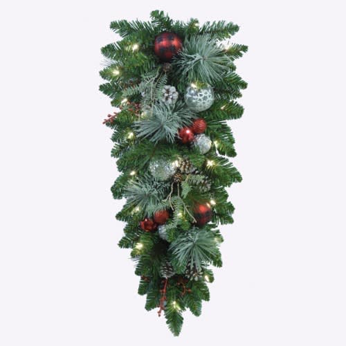 Make your entrance merry with this lush, beautiful Christmas wreath. Resembling a fresh mixture of Scotch pine, noble fir, and cedar, all accented by real pinecones and a dusting of glitter, this wreath has a dimensional and realistic look. Pre-lit with 50 dual colour function LED lights, and battery-operated so that no messy cord hangs from your wreath. The batteries operate on a timer, allowing you to pre-set for 6 hours on and 18 hours off throughout the festive season. 3 x D batteries are required (batteries not included). Suitable for indoor and covered outdoor use.