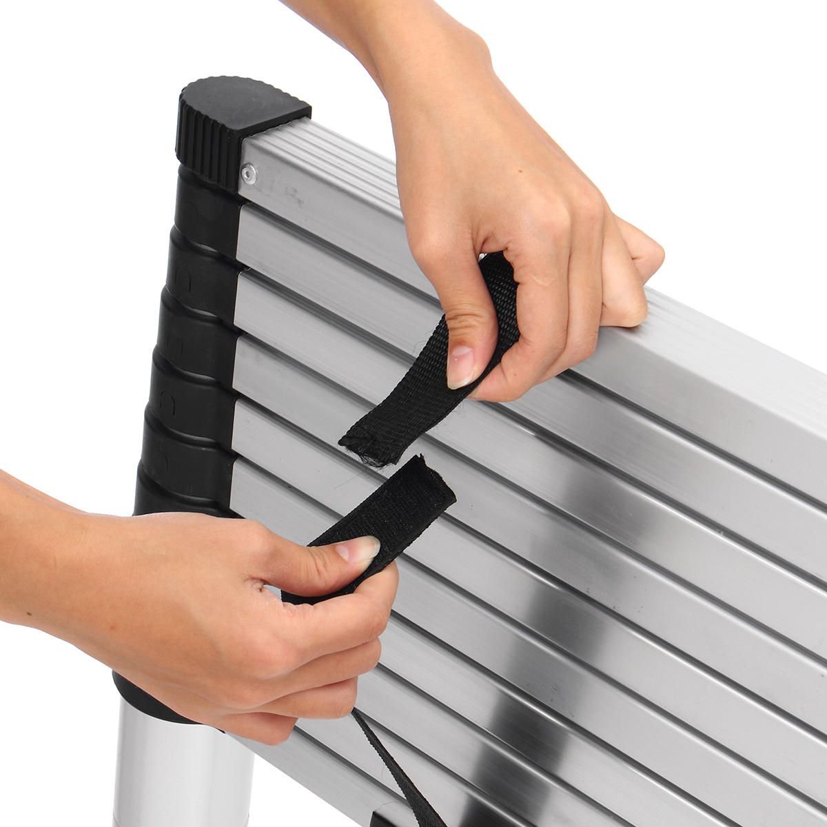 Lightweight and compact size, easy to transport and store; a heavy duty closure strap secures the ladder firmly, easy to carry it with one hand.