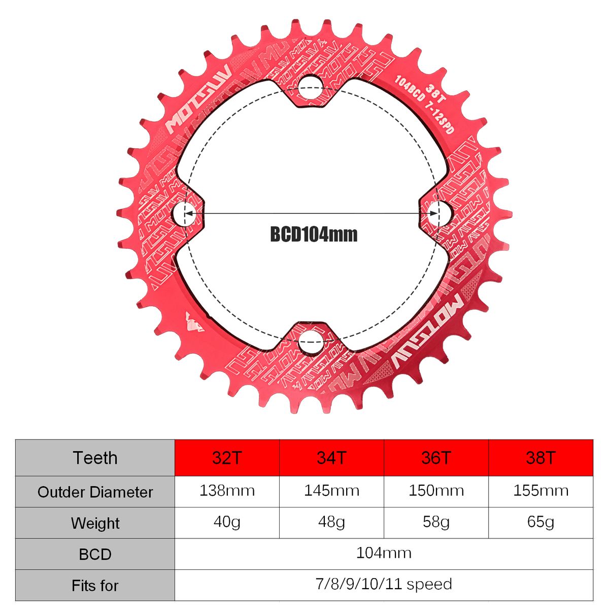 Teeth: 32T / 34T / 36T / 38T (optional)