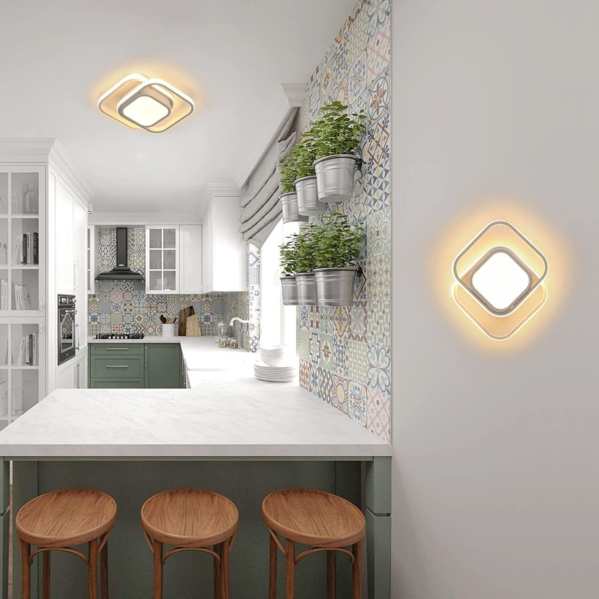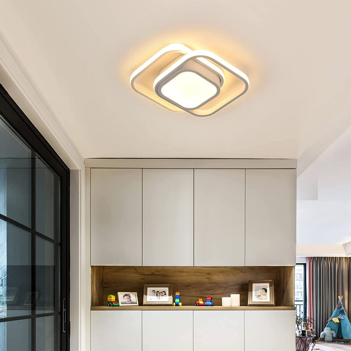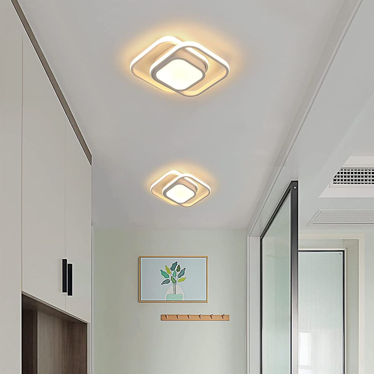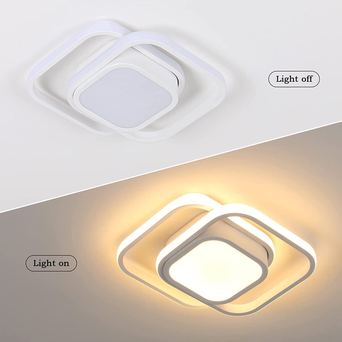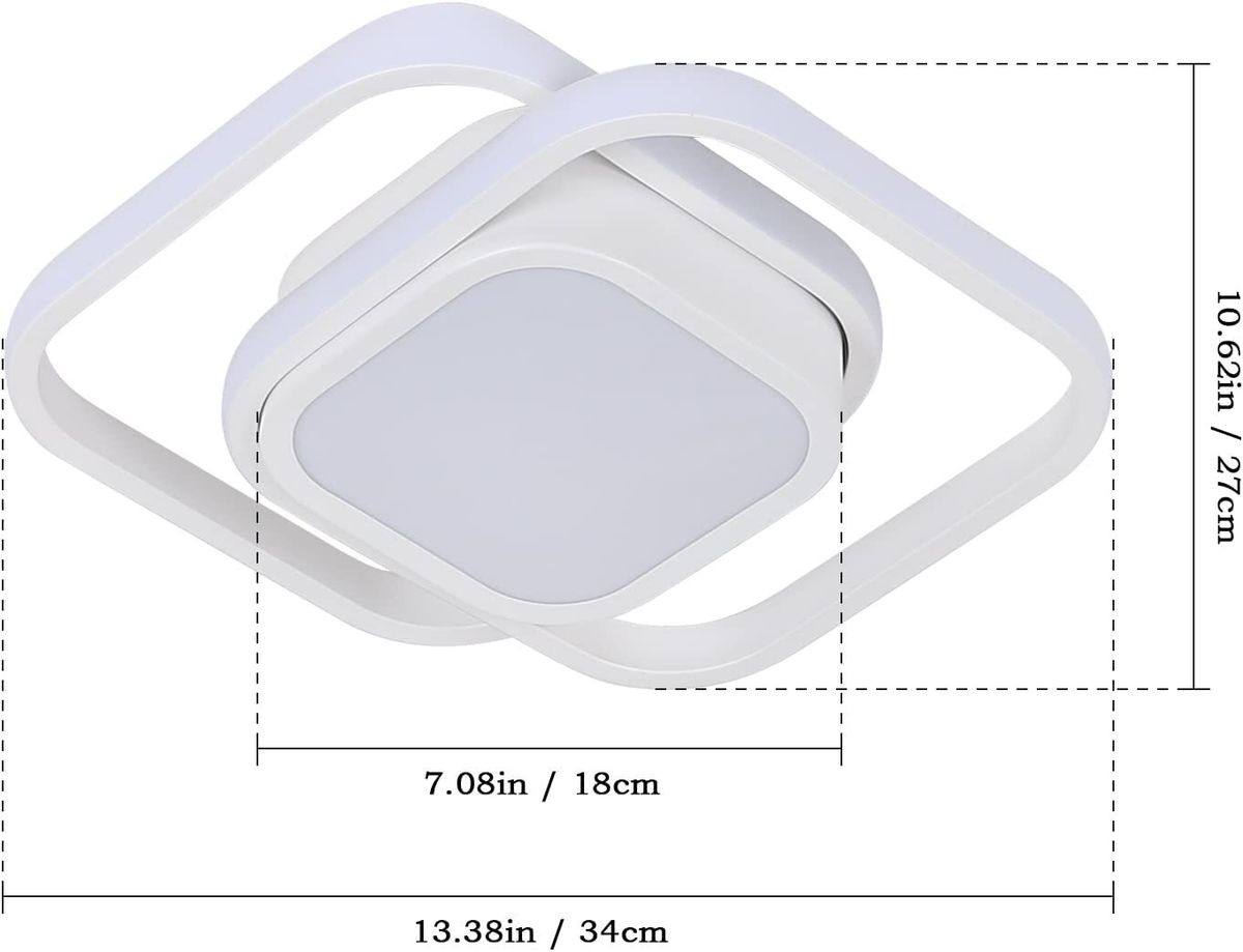 Modern Minimalist Design: A geometric shape made up of two rectangles, simple and elegant in appearance, will amaze your family and friends. Installation is simple, All-in-one design, easy to clean.LED Ceiling Light Parameters: Size: 34 x 27cm (13.38 x 10.62inch); Weight: 0.91kg; Power: 32W about 2400lm; White color; Light color: Warm light.Material: The hallway led ceiling light is made of high quality aluminum and silicone, the lamp body is made of metal (iron aluminum), and the surface is painted. The lampshade is made of silicone, with high light transmission, uniform color and eye protection.Led Hallway Lights: 3000K warm light, 220V input voltage. The appearance is small and simple, and the design style is modern. The LED ceiling light has a luminous area of 10-15 square meters and an average life of 30,000 hours.LED Light Source: Power: 22W, the ceiling light has a new built-in LED chip light source, high brightness, energy saving and environmental protection, no stroboscopy and long service life. Fixed, non-rotating, non-dimmable device.Widely Used: Modern ceiling lights are ideal for interior lighting. Suitable for living room, bedroom, dining room, kitchen, children's room, as well as porch and hallway.
