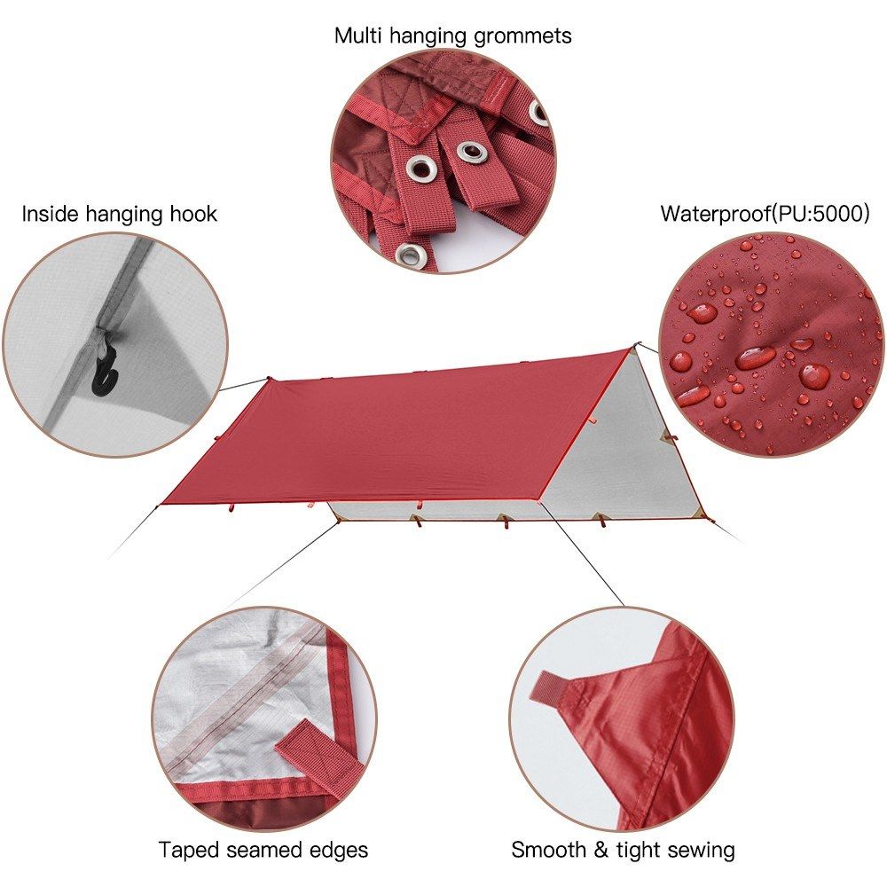 Can be used as a survival tarp, hammock shelter, outdoor kitchen cover, simple tent, tent footprint, ground sheet.