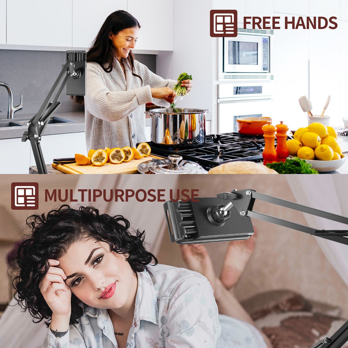 FLEXIBLE AND STRONG: Each arm length: 13.8inches/35cm; Extend up to Approx.33inches/83cm; Double-braced arms add strength; Made of quality metal frame, plastic phone clip, Maximum bearing capacity: 1.54lbs/0.7kg