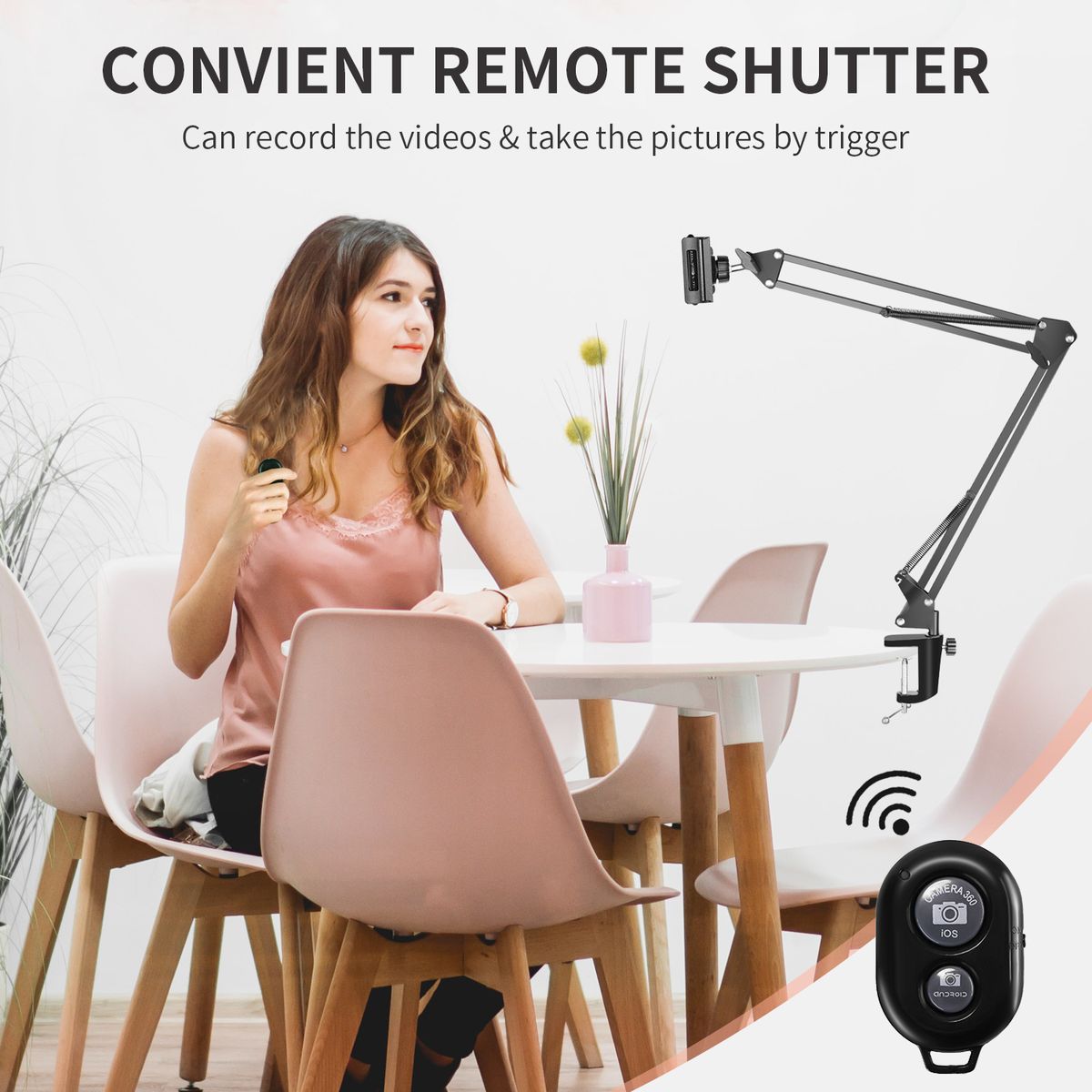 MULTIPURPOSE USE: Folding type, convenient to carry; This scissor arm phone stand and remote kit can be apply to any stores, families, stages, studios, broadcasting and TV stations ,etc